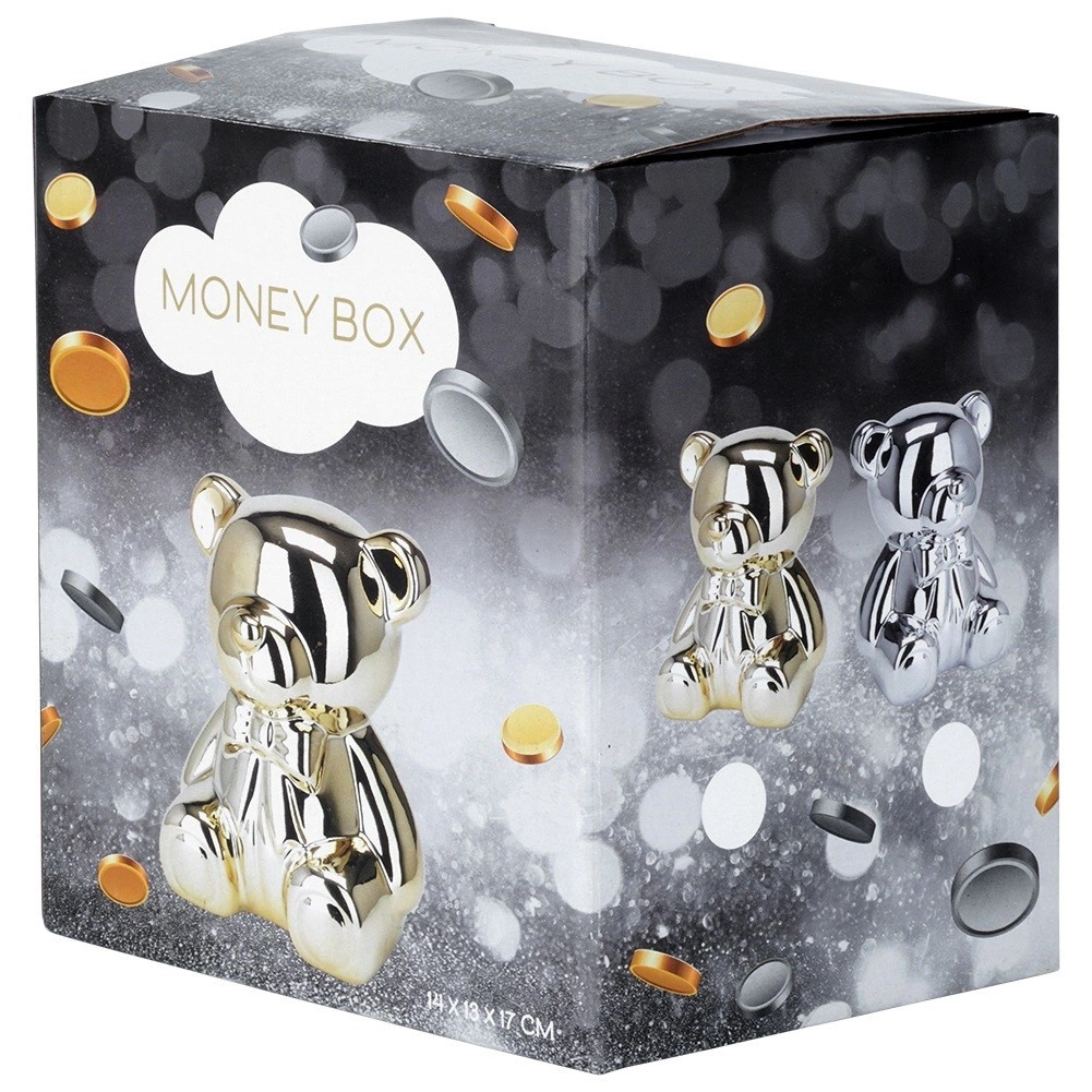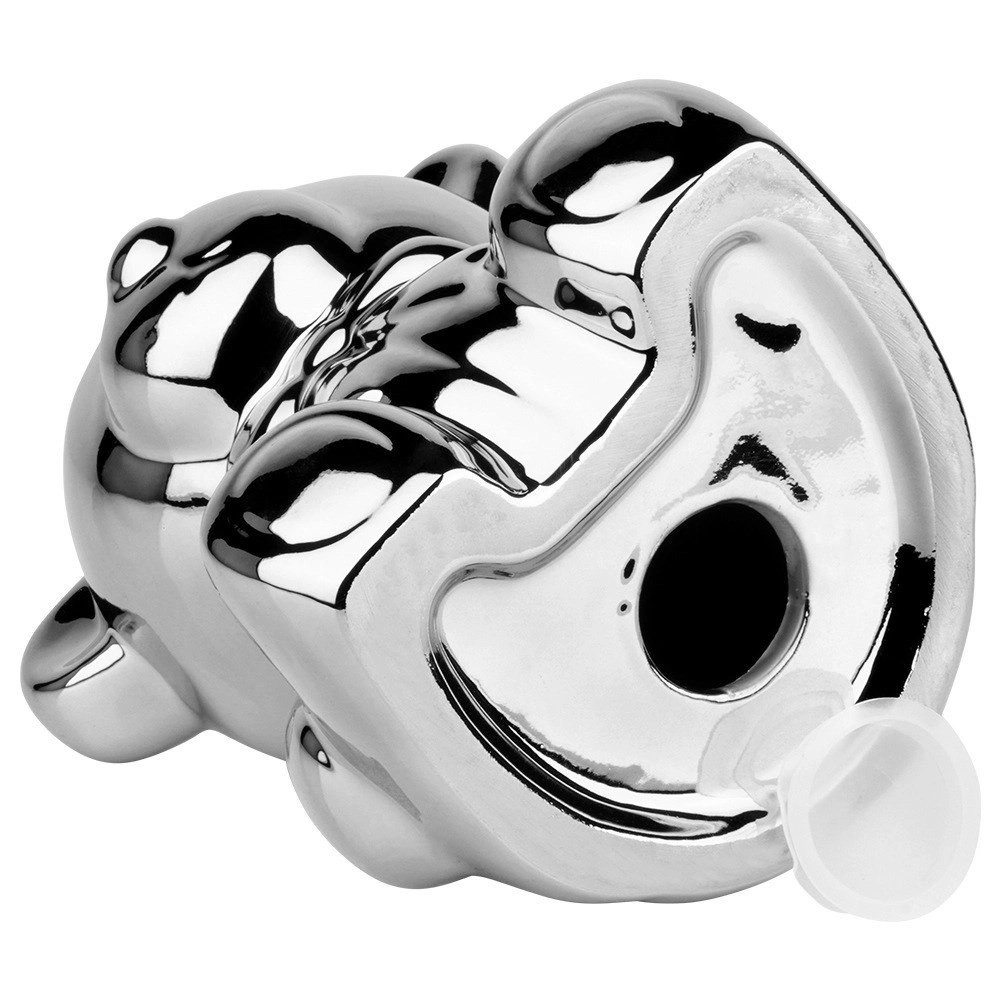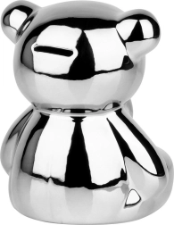 Тази сребърна керамична касичка във формата на мече съчетава модерен глем дизайн с практична употреба. Огледалният блясък придава на интериора щрих лукс и едновременно мотивира към редовно спестяване на монети и банкноти.