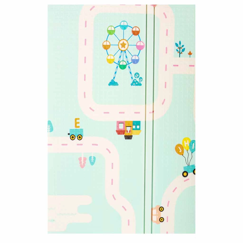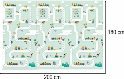 Двустранната пяна постелка с размери 180 × 200 × 1 см създава безопасно и удобно пространство за игра, първи обръщания и пълзене. Плътната XPE пяна омекотява ударите, предпазва от студ от пода, а противохлъзгащата текстура осигурява стабилност при движение. Едната страна с очарователни панди и другата с пътен мотив подпомагат фантазията и ученето.
