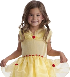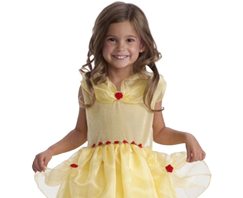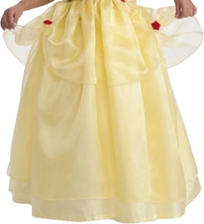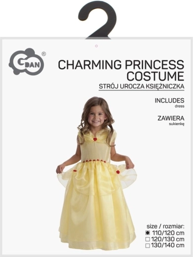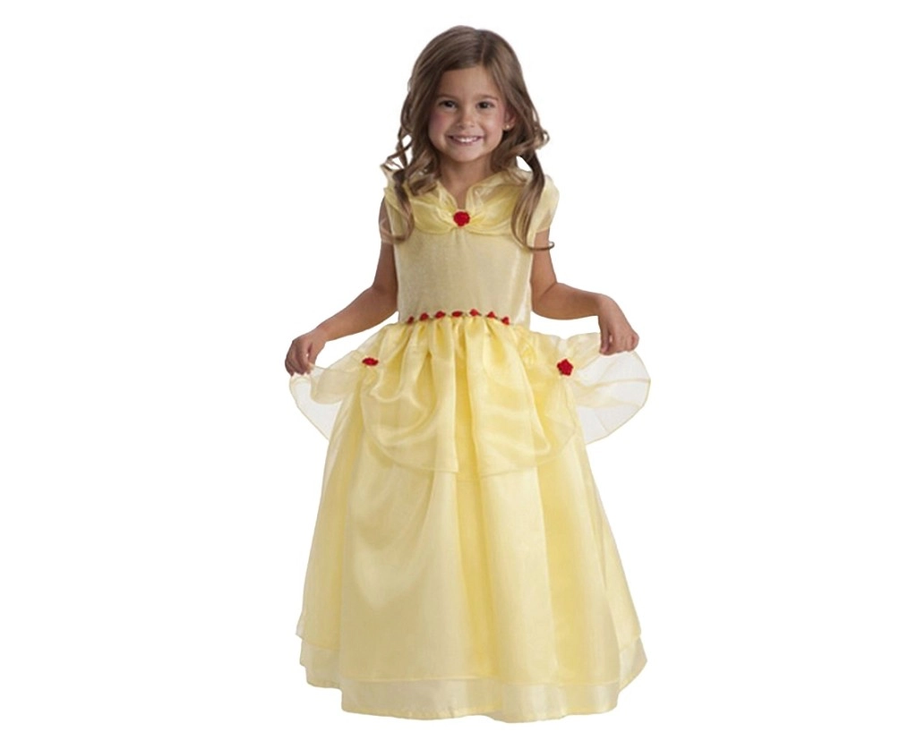 Този очарователен костюм, вдъхновен от любимата приказна героиня, превръща всяко малко момиче в истинска принцеса. Роклята в наситено жълт цвят има ефирна, многослойна пола за красив обем, шифонови покривки и цветни апликации, които придават тържествен вид.