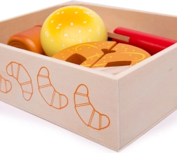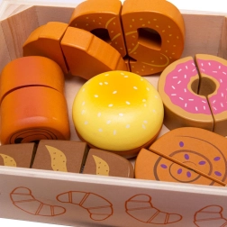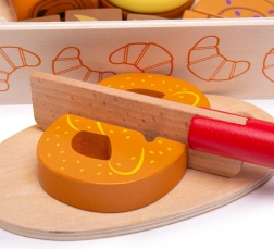 Всеки елемент от печивата е свързан с велкро и може да бъде „нарязан“ с дървения нож за по-реалистична игра.