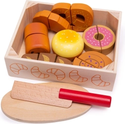 Представяме ви дървен комплект за рязане на печива, създаден за всички деца, които искат да изследват магията на кухненския свят. Този цветен сет включва различни форми печива като кроасани, понички и хляб, които могат да се „режат“ благодарение на включения дървен нож. Играчките са изработени от качествено дърво и свързани с велкро, което позволява интерактивна и реалистична игра.