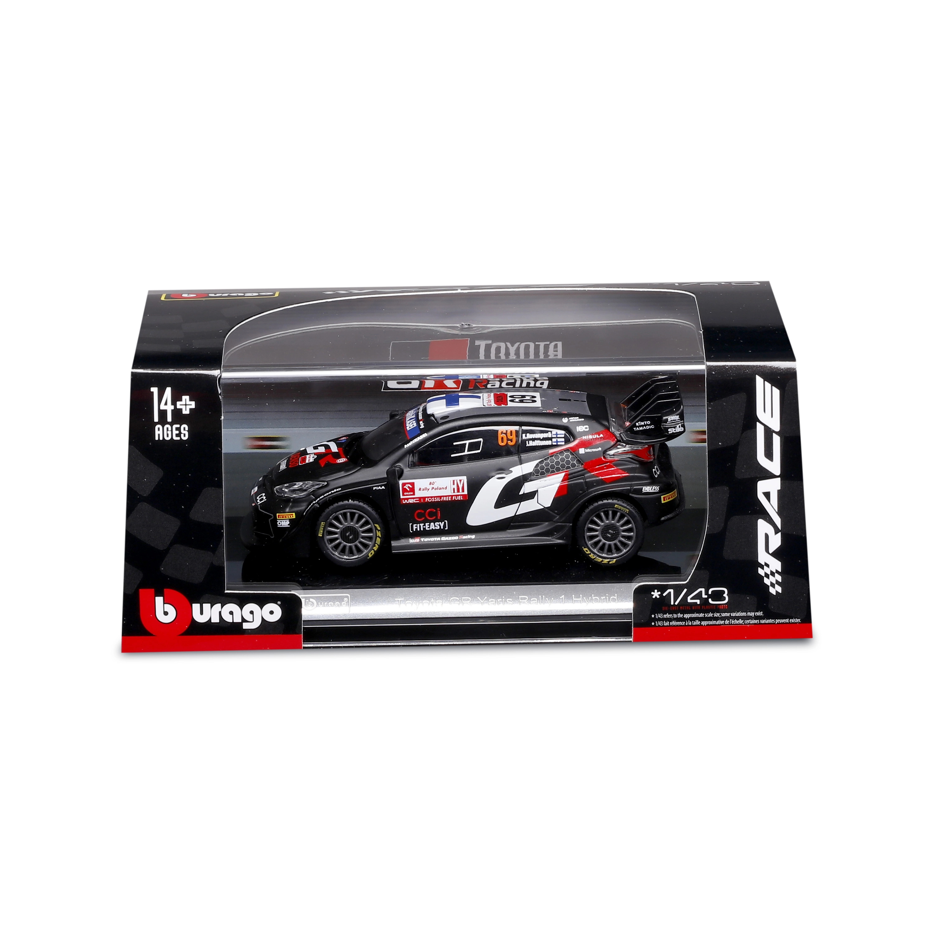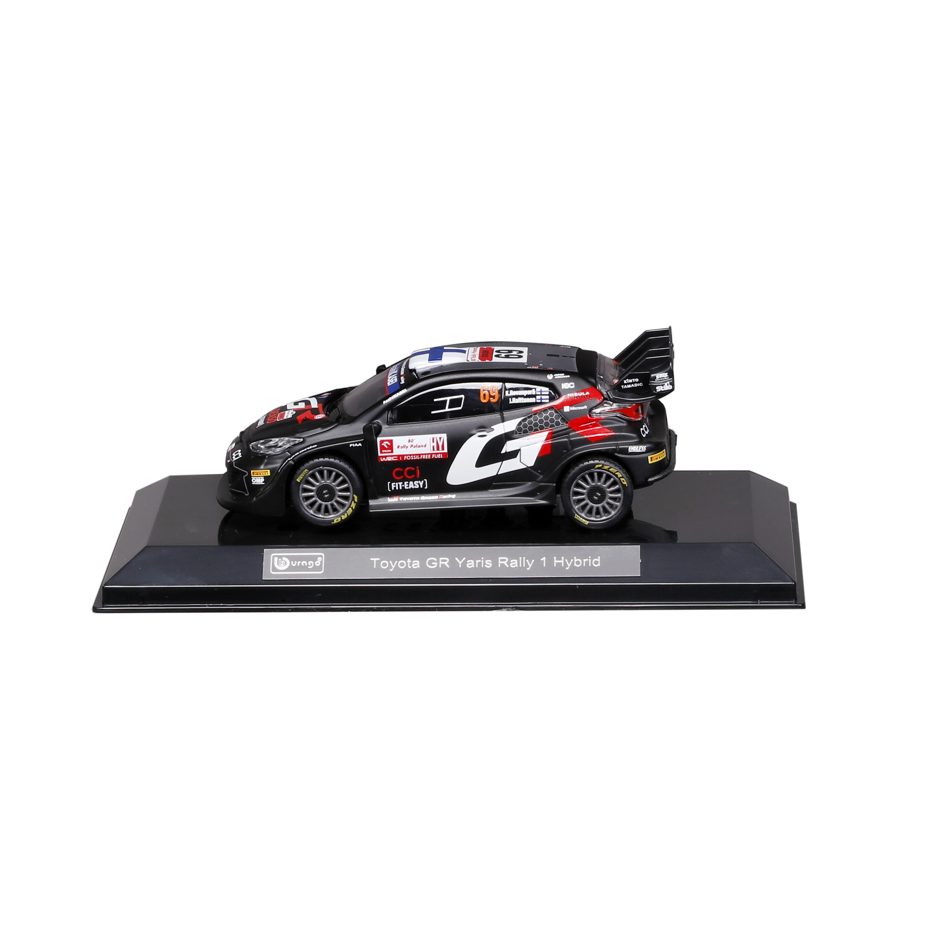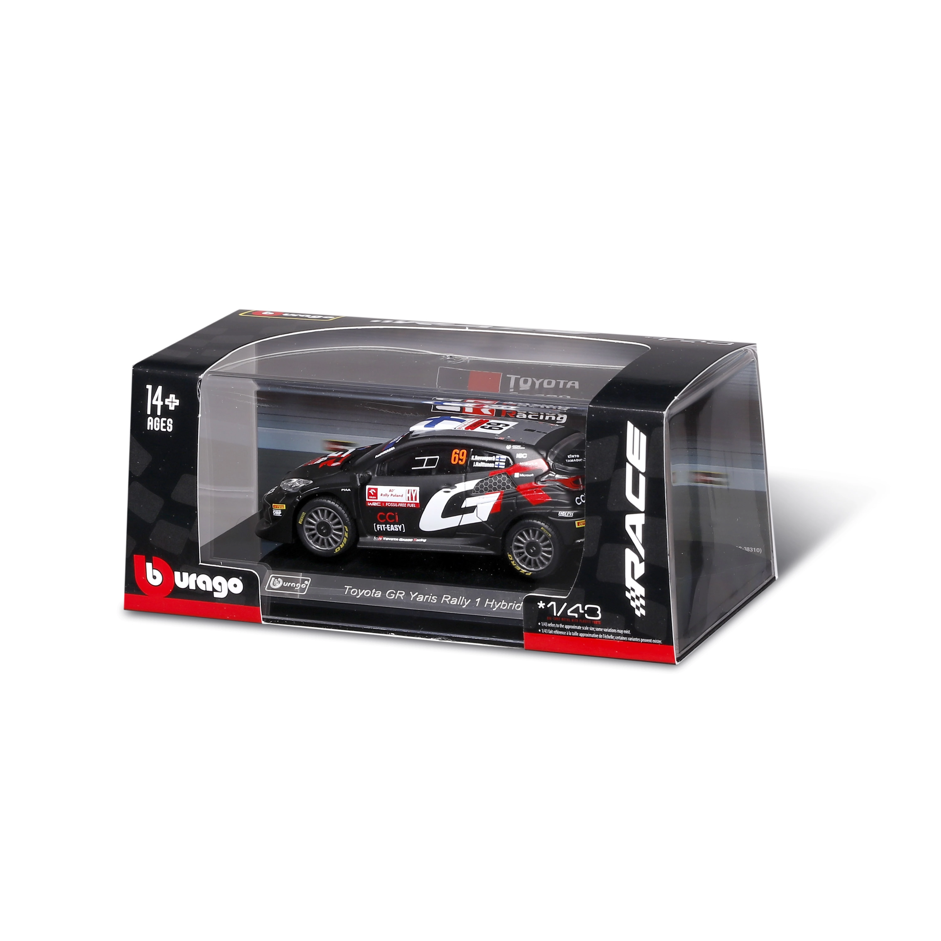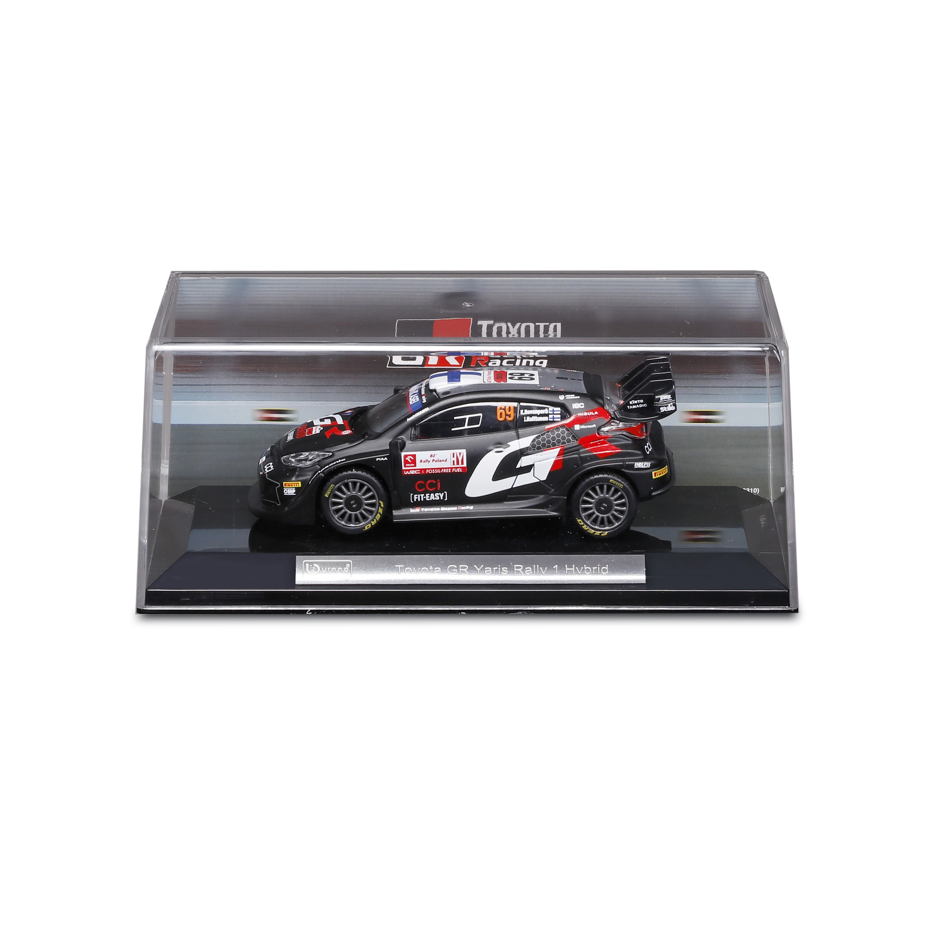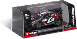 Колекционерският модел на автомобил Bburago в мащаб 1:43 реалистично представя TOYOTA GR YARIS RALLY1 HYBRID с номер 69. Предлага детайлни спонсорски тампопечати, аеродинамични елементи и свободно въртящи се колела – идеален за експониране и леко играене в качествена подаръчна кутия с витринен прозорец.