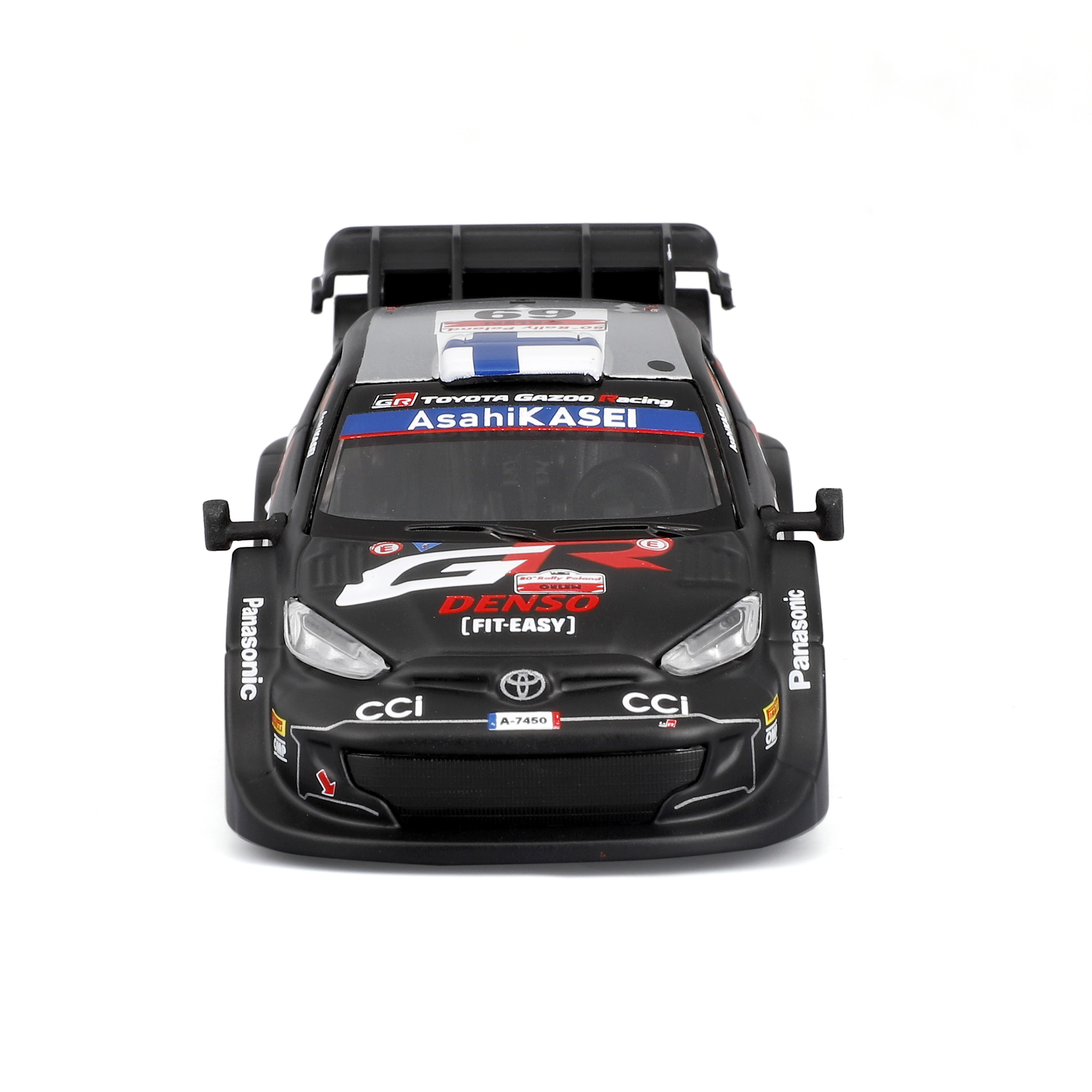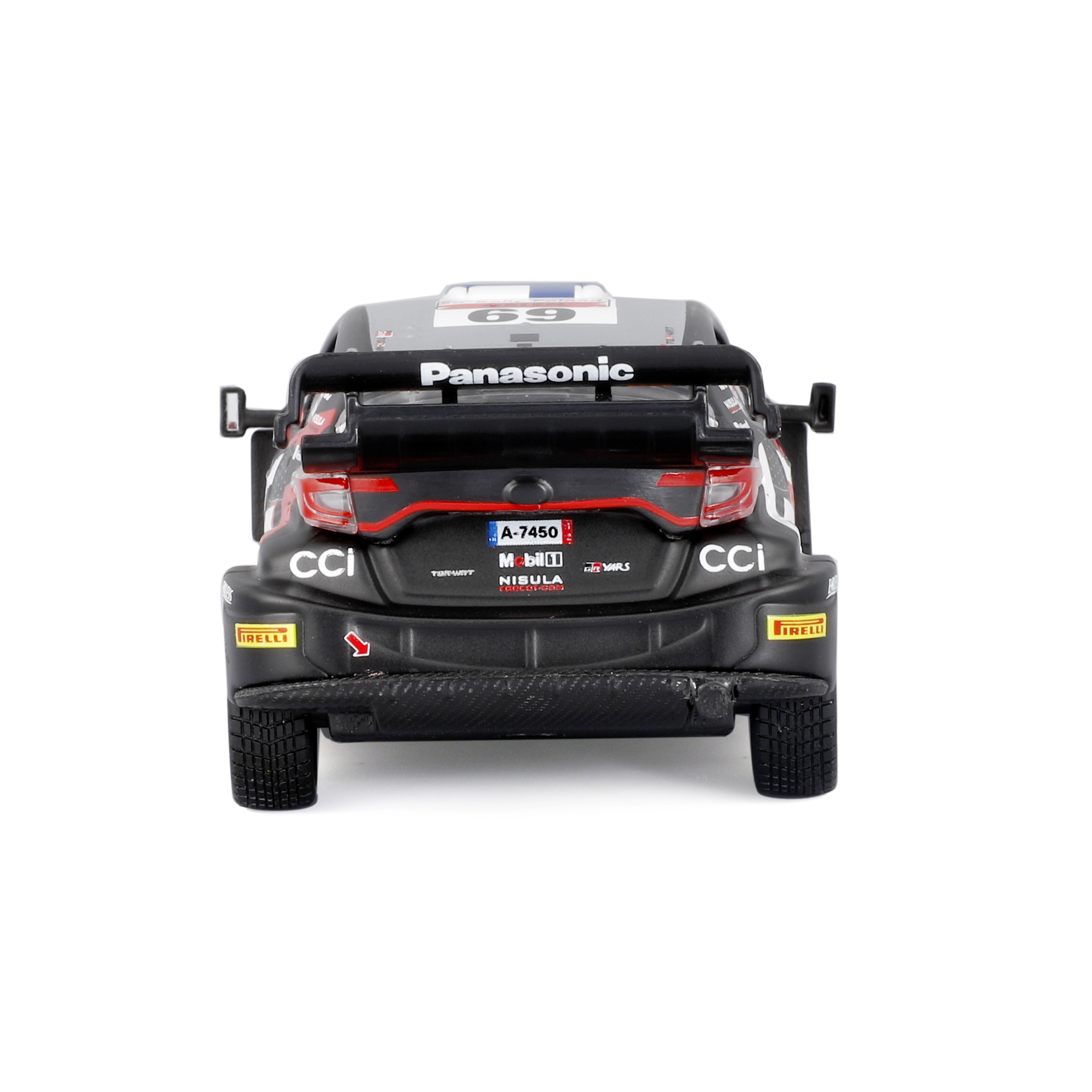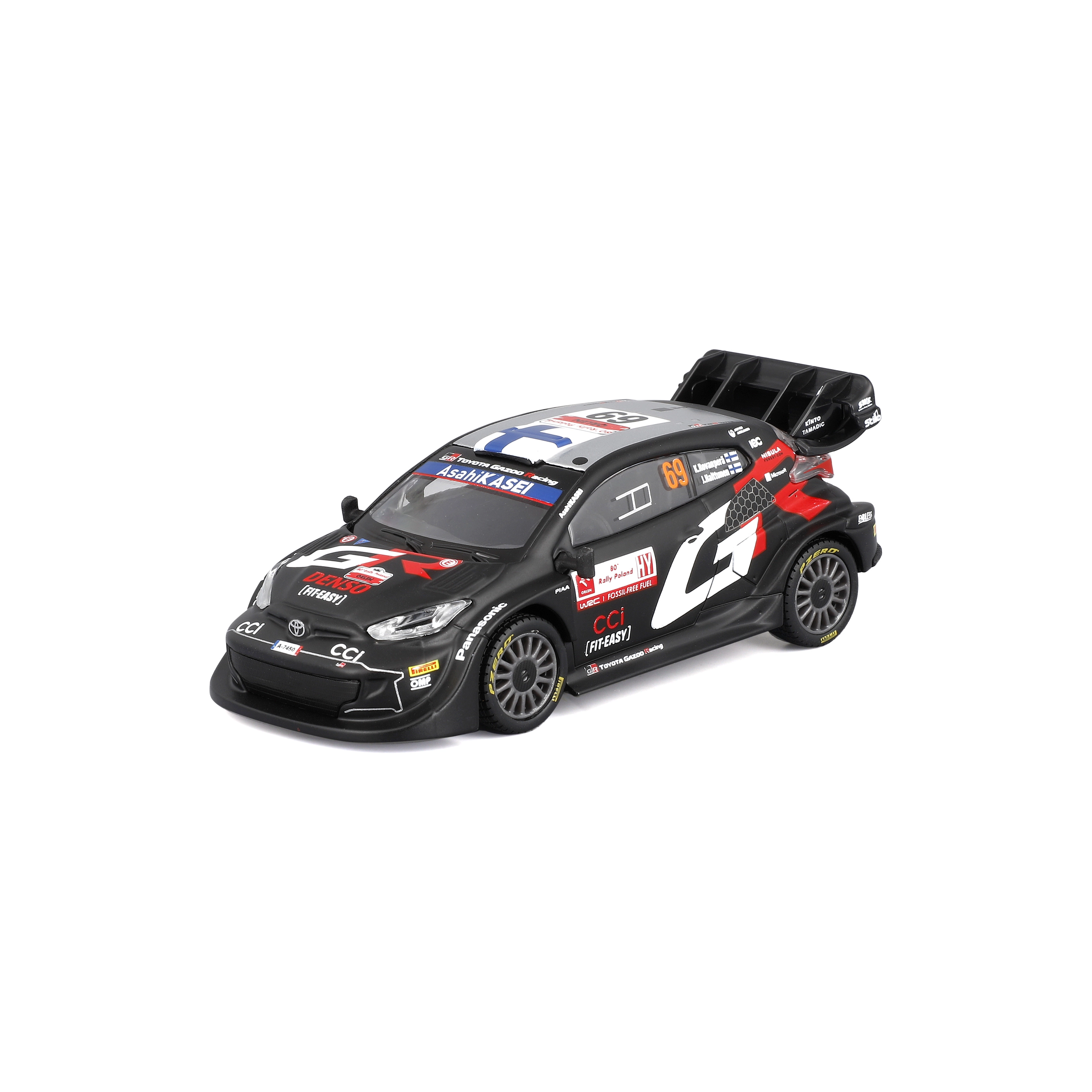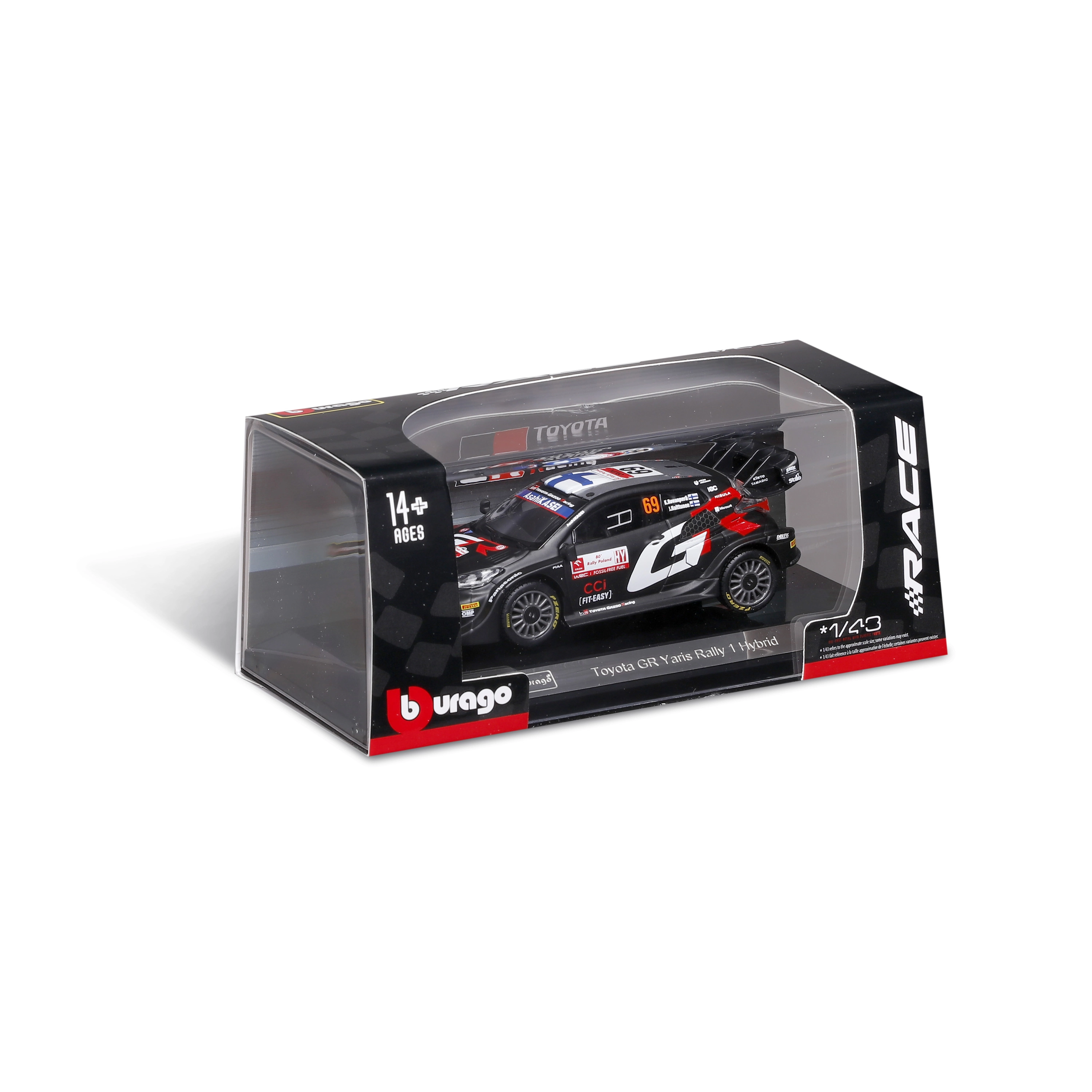 Колекционерският модел на автомобил Bburago в мащаб 1:43 реалистично представя TOYOTA GR YARIS RALLY1 HYBRID с номер 69. Предлага детайлни спонсорски тампопечати, аеродинамични елементи и свободно въртящи се колела – идеален за експониране и леко играене в качествена подаръчна кутия с витринен прозорец.