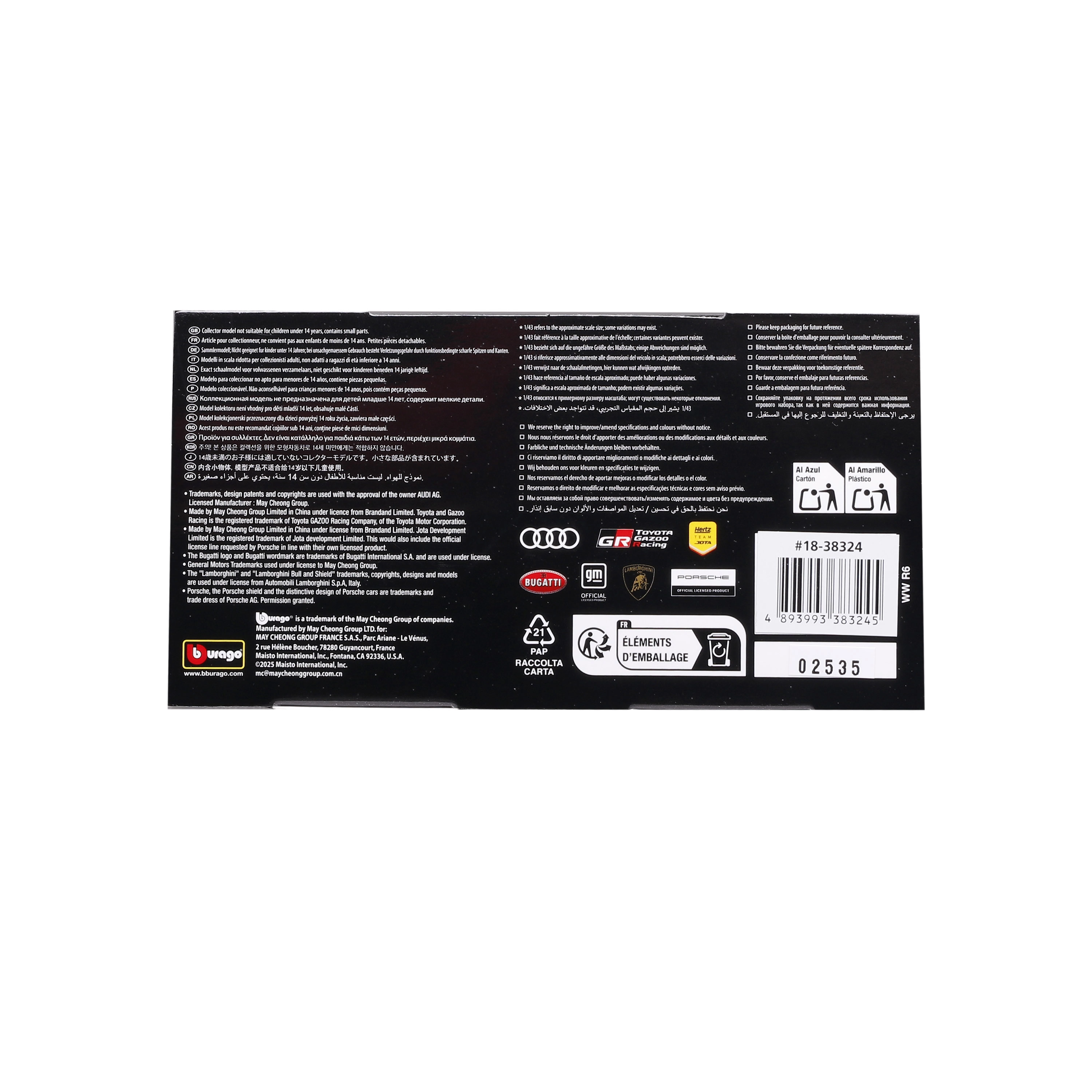 Мащаб 1:43 се отличава с устойчиво изпълнение и чисти детайли – от голямото задно крило през фаровете до логата на партньорите. Благодарение на защитната подаръчна кутия с ефект на стъклен прозорец е подходящ и като стилен подарък за колекционери.