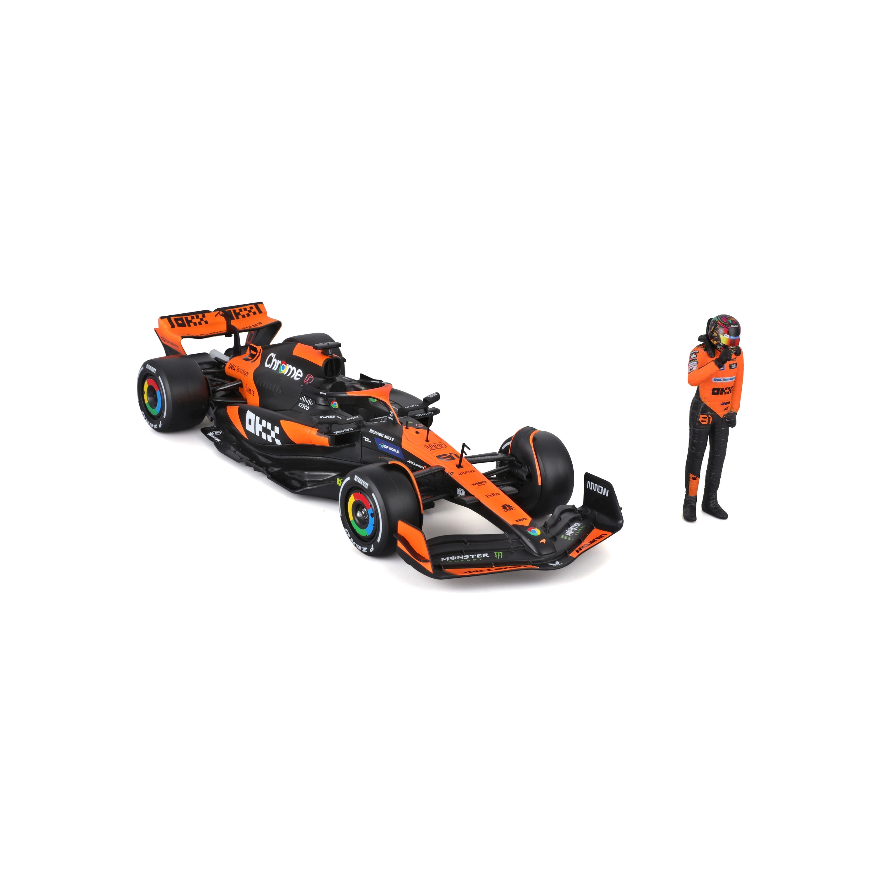 Прецизен печат на спонсори, оранжево‑черно оцветяване и детайлни крила, дифузьор и halo за автентична визия на болида McLaren MCL38.