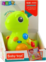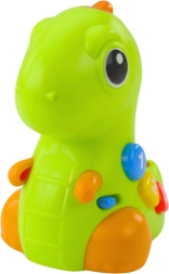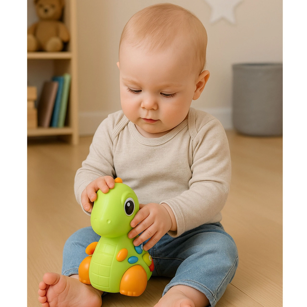 Интерактивният динозавър грабва вниманието на децата от пръв поглед: при натискане на цветните бутони светва, пуска мелодии и издава весели звуци. Леко почукване по нослето стартира музика и движение, което подпомага разбирането на връзката между допир и реакция на играчката – чудесна основа за учене чрез игра.