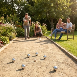 Насладете се на социална игра за малки и големи. Петанк е прост и забавен – целта е да хвърляте топките възможно най-близо до дървеното кошонче. С компактното куфарче ще вземете комплекта за петанк удобно в двора, на плажа, на пикник или за уикенд извън града.