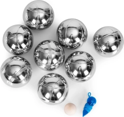 Топките от хромирана стомана съчетават издръжливост и елегантен вид. Три различни накатени шарки позволяват бързо различаване по време на игра. Добавеният мерителен шнур помага прецизно да определите кой е по-близо – честна игра без спорове.