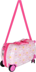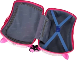 Конструкцията на куфара позволява на детето удобно да седи и да бъде теглено с помощта на презрамка. Стабилните страни и поставките за крака повишават комфорта и безопасността.