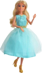 Куклата Лили впечатлява с вечен стил и детайлно изработен тоалет. Фино блестящата тюлена пола придава лекота на роклята, докато златистите обувки, колие и обеци подчертават нейния елегантен вид. Идеална за ролеви игри, разказване на истории и развитие на детското въображение.