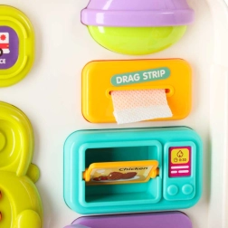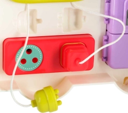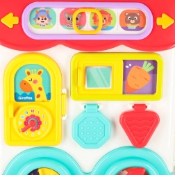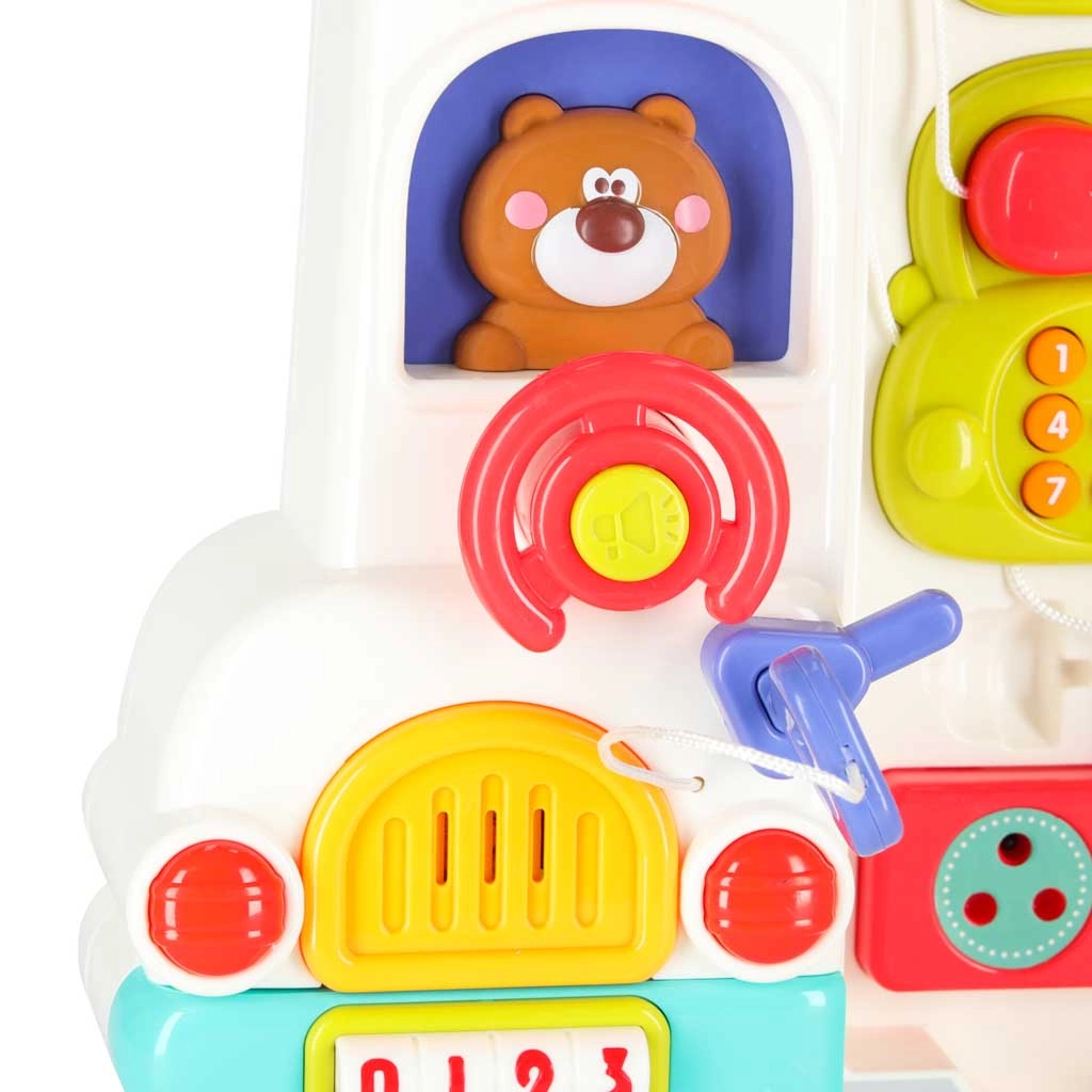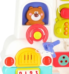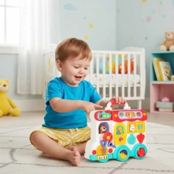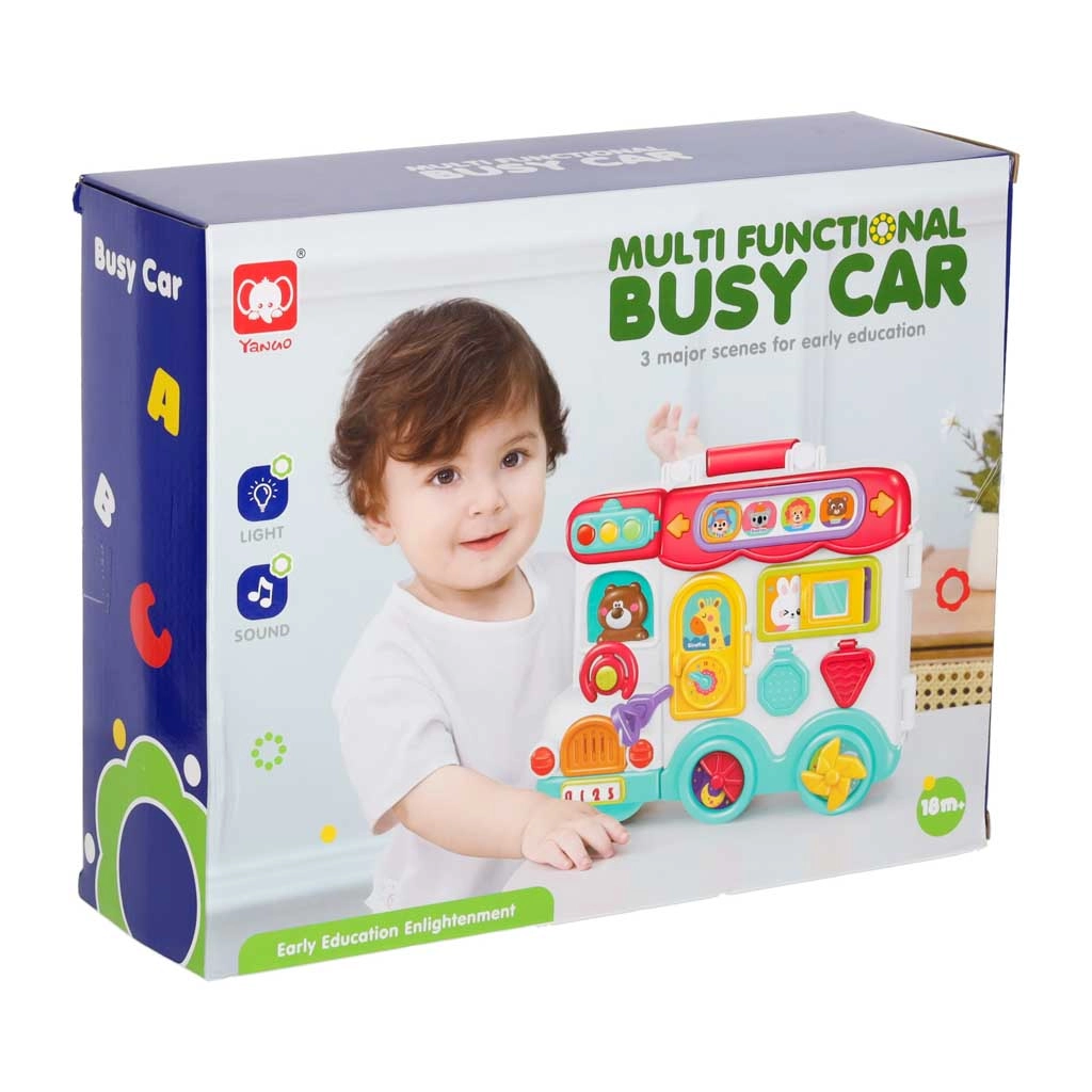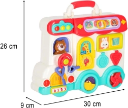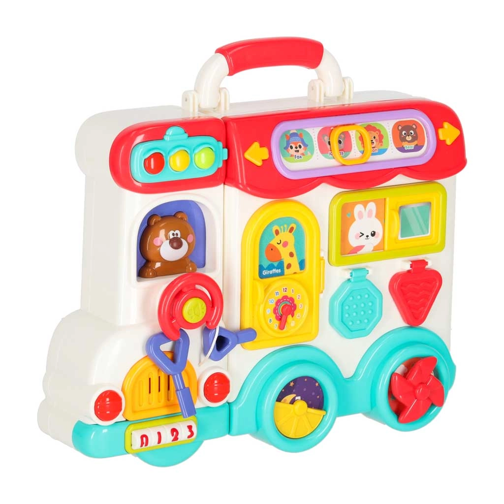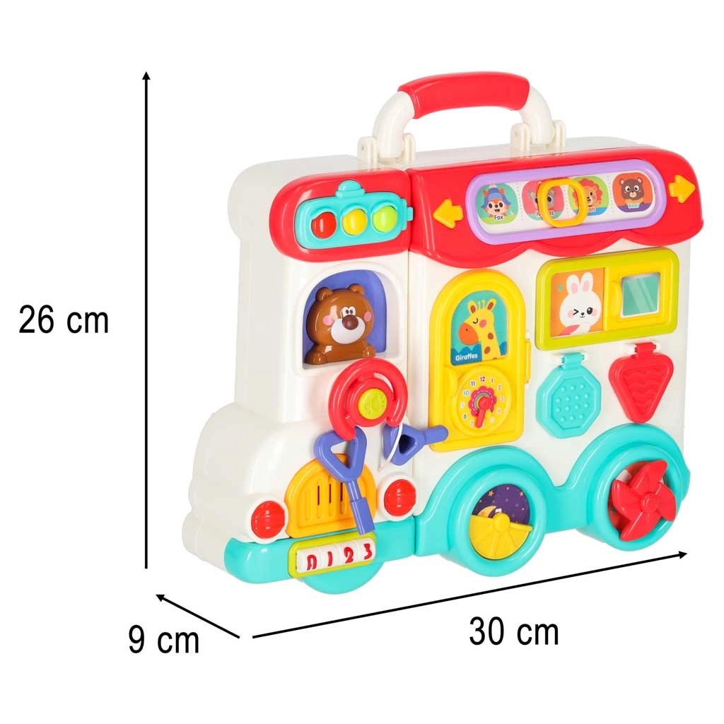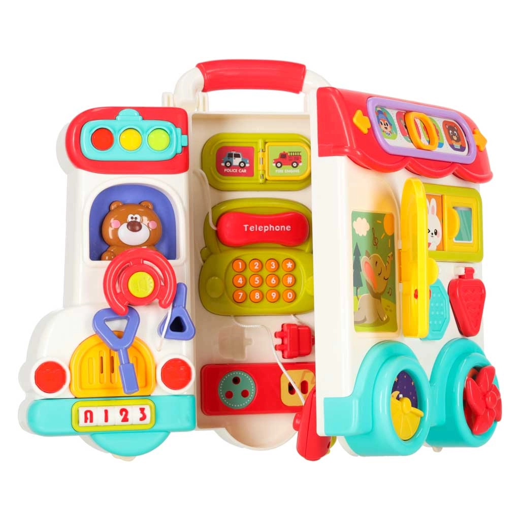 Този интерактивен образователен автобус в практична куфарна форма е мобилен център за откривателство. Децата ще въртят волана, ще натискат клаксона със светлинен ефект, ще плъзгат прозорчета, ще разкриват пътни знаци, ще настройват стрелките на часовника и ще опознават животни. При обръщане на другата страна се превръща в логически и сензорен панел с телефон, микровълнова, „хладилник“ със светлина и тренировка за правилно съчетаване.