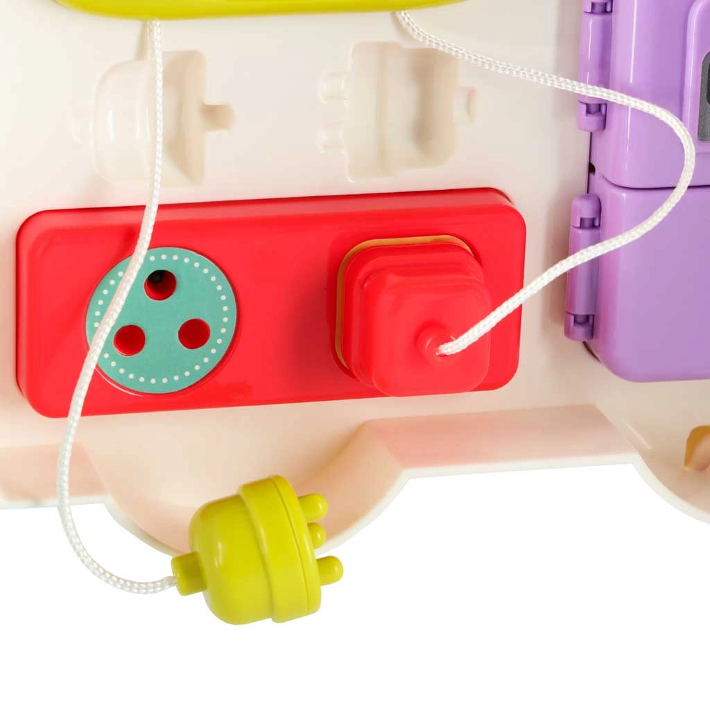 Отварящият се автобус се превръща в интерактивен панел с бутони, клапи и прозорчета. Детето играе и едновременно развива фината моторика и наблюдателността.