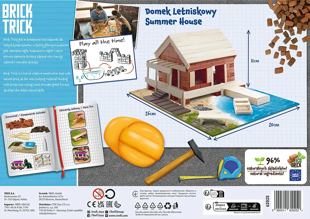 Открийте креативния свят на строителството с оригиналния конструктор Trefl Brick Trick Лятна резиденция M. От истински глинени тухлички и дървени летвички ще построите къща стъпка по стъпка, а благодарение на разтворимото лепило можете да строите отново и отново. Комплектът развива мануални умения, въображение и концентрация – идеално забавление за малки и големи строители.