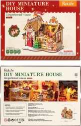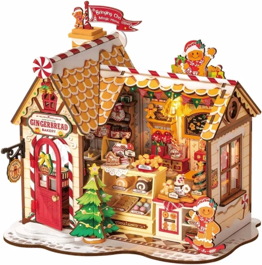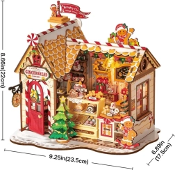 Този детайлно изработен 3D дървен пъзел на джинджифилова къщичка внася празнично настроение във всеки интериор. Матов покрив със захарни бастунчета, червена врата, витрини, пълни с вкусотии, и уютна топла LED светлина създават уникална миниатюра, идеална за рафт или перваз на прозорец. Сглобяването не изисква лепило или инструменти – елементите прецизно се свързват и крайният модел е стабилен.
