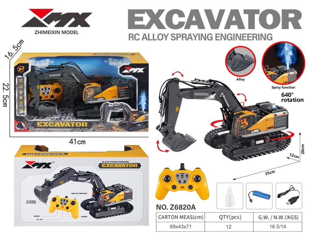 Управлението на честота 2.4 GHz с обсег до 30 m предоставя плавно контролиране без смущения. Кулата се върти до 640°, така че можете точно да симулирате реални строителни дейности. Багерът предлага светлинни и звукови ефекти и атрактивен ефект на пара (spray), който усилва изживяването при движение и копаене.