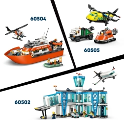 Включени са 4 минифигурки – пилот, двама членове на бреговата охрана и цивилен – плюс спасителна капсула и фигурка на акула. Богатото оборудване (бинокъл, уоки-токи, аптечка) подкрепя креативността, отборната игра и развитието на фината моторика. Сглобяването се улеснява от приложението LEGO Builder с интерактивни 3D инструкции.
