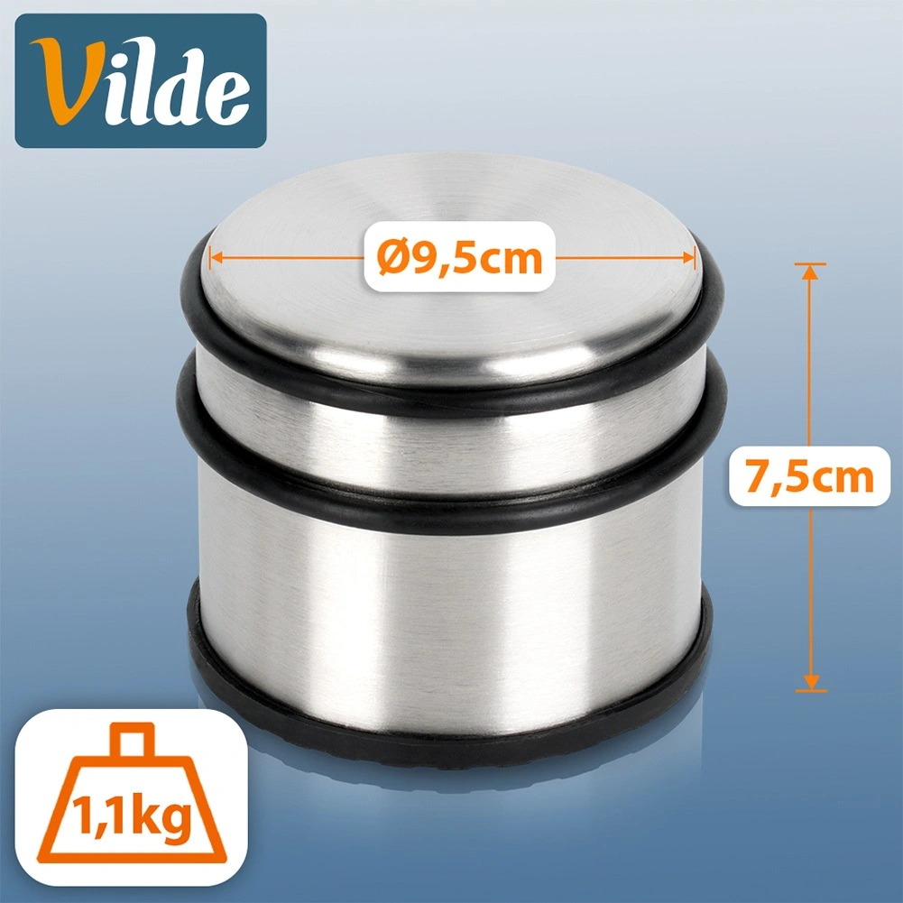 Елегантен и тежък стопер за врати от неръждаема стомана в сребрист цвят, идеален за апартамент, къща и офис. Високото тегло 1,1 кг осигурява стабилност, така че вратите остават там, където са ви нужни. Гумените пръстени по обиколката защитават вратата от удари, а гумената основа предотвратява плъзгане и пази пода.