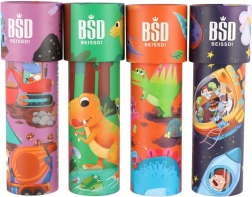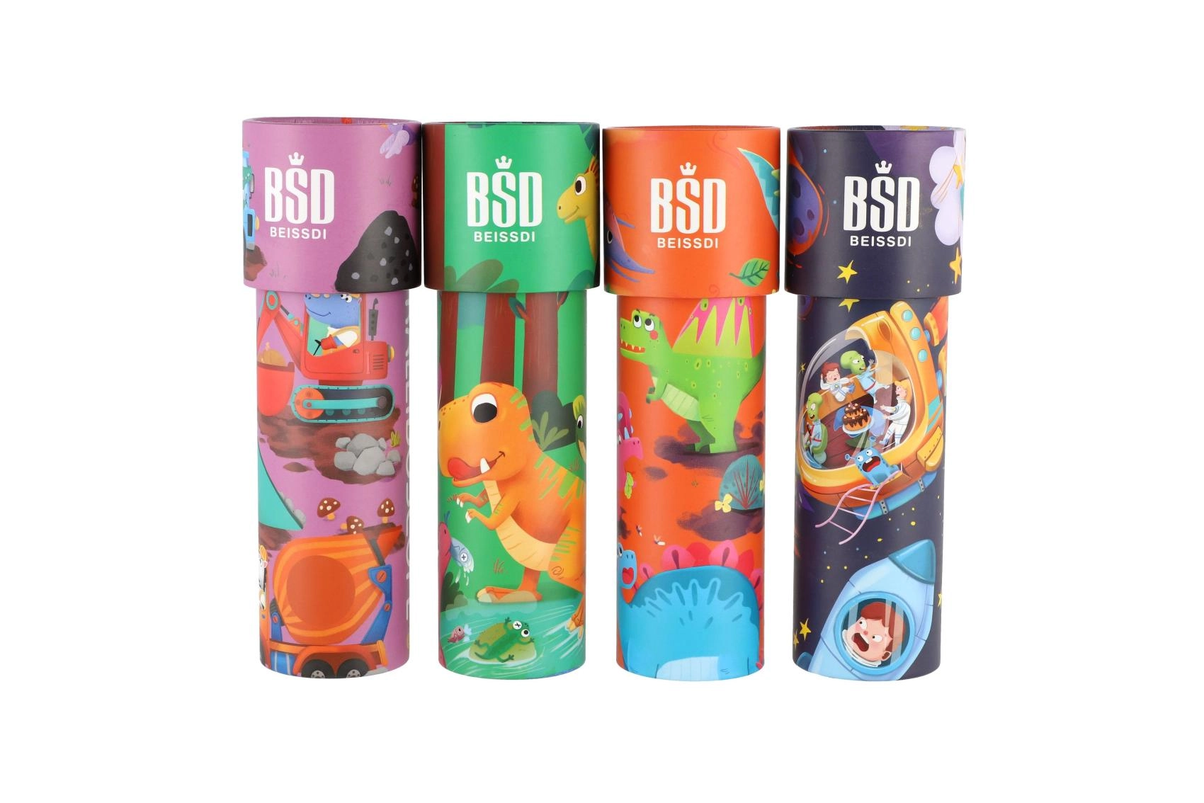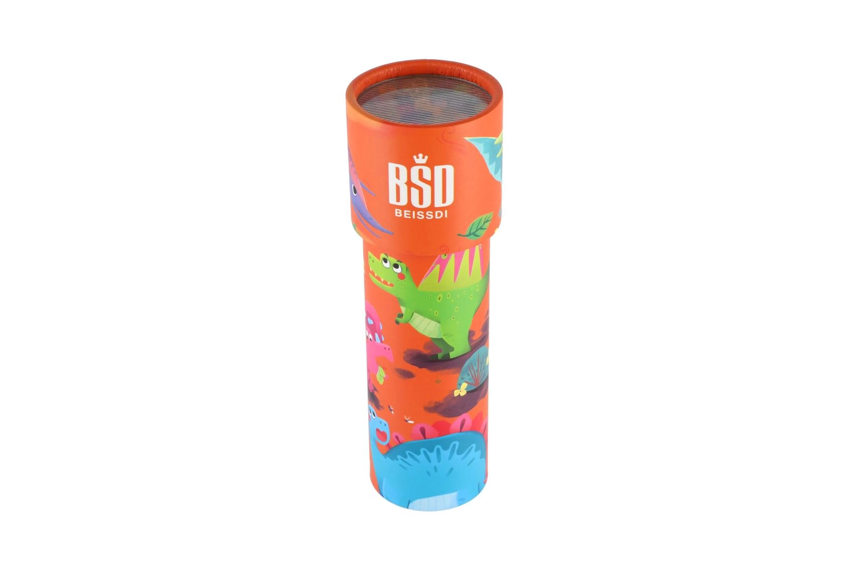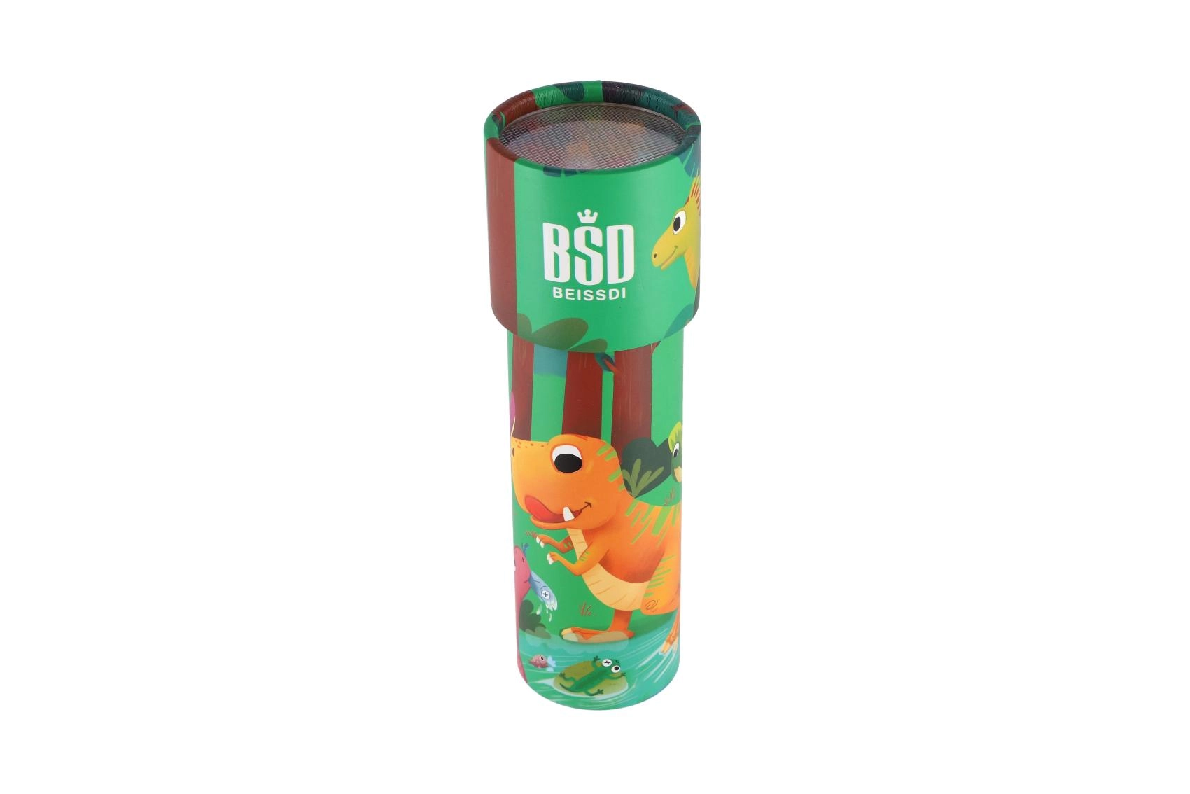 Забавните илюстрации на динозаври стимулират детското въображение и превръщат калейдоскопа в атрактивен малък подарък.