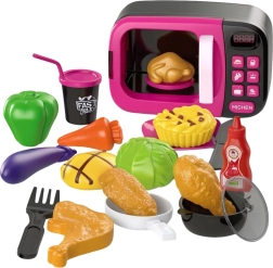 Тази модерна розова детска микровълнова фурна правдоподобно наподобява истински кухненски уред. След включване светва и издава звуци, докато въртящата се чиния плавно завърта поставената „храна“. Децата се радват на автентична игра на готвене и усвояват основни домашни дейности.