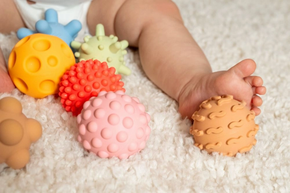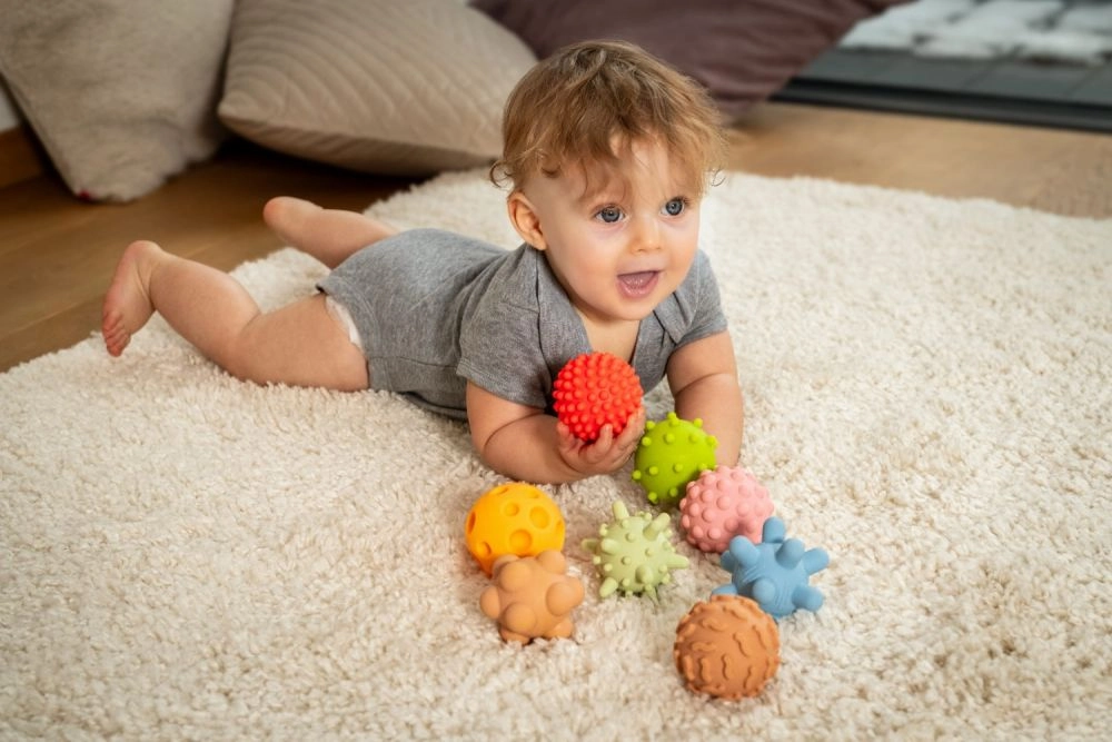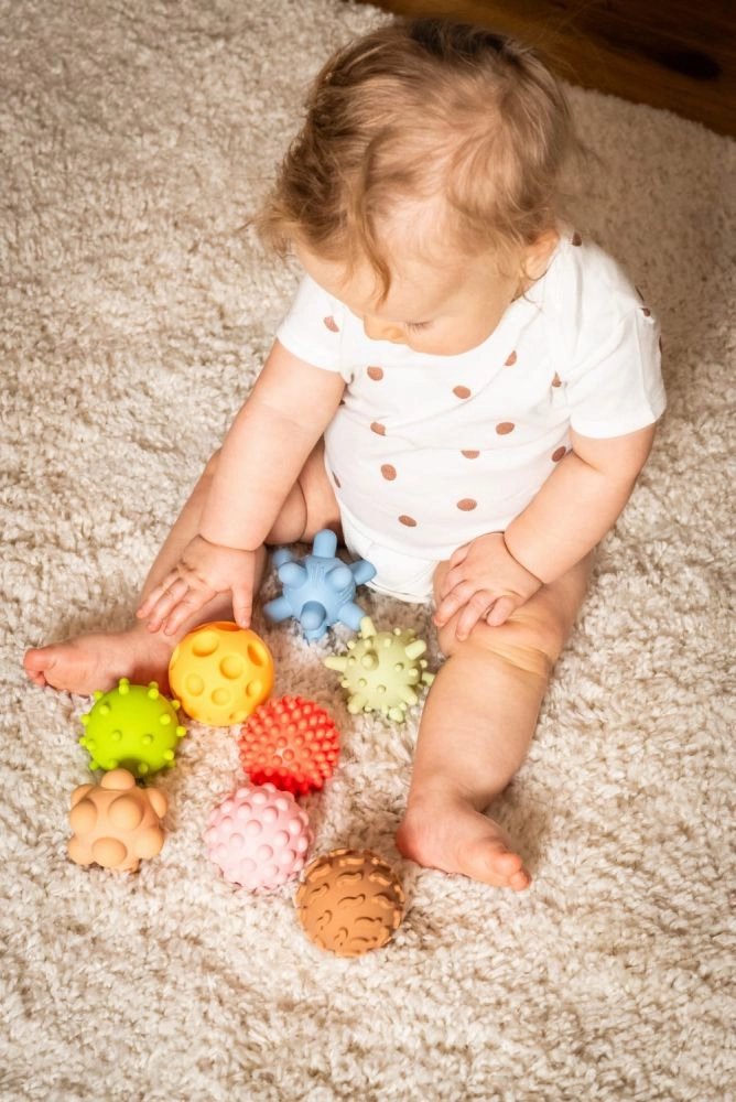 Всяка топка има уникална повърхност с релеф, пъпчици или каналчета, които подпомагат осезанието и естественото любопитство на детето.