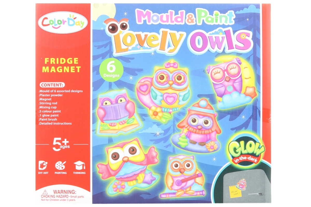 Креативен комплект за деца, с който лесно ще изработят собствени магнитчета във форма на совички, които светят в тъмното. Комплектът съдържа всичко необходимо – гипс, форма с 6 мотива, бои, четка, магнити и инструкции. Идеално забавление за деца от 5 години и прекрасен подарък за малките творци.