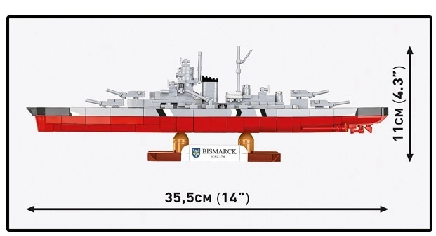 Открийте силата и историята на емблематичния германски броненосен колос BISMARCK. Този висококачествен конструктор в мащаб 1:700 вярно пресъздава силуета, въоръжението и характерната окраска на кораба. Благодарение на 590 прецизни елемента ще се насладите на приятно и плавно сглобяване с резултат, който изглежда чудесно на рафта.