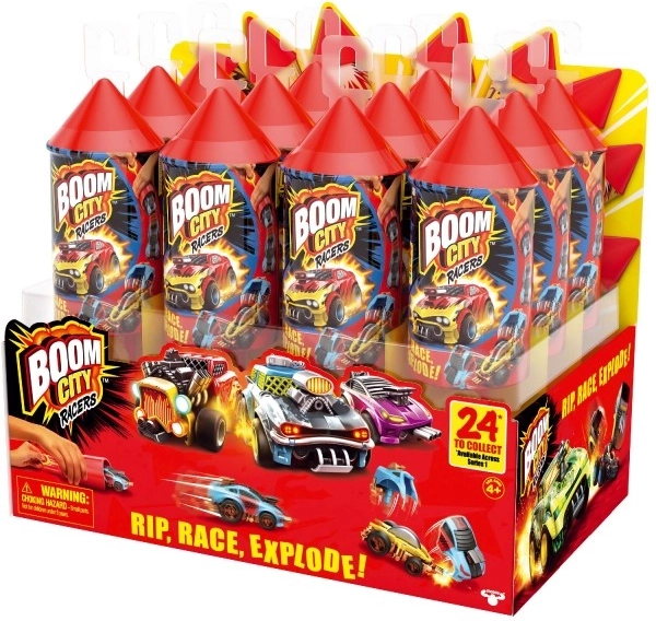 BOOM CITY RACERS носи екшън, скорост и изненада във всяка опаковка. Достатъчно е да дръпнете пръстена, да изстреляте ракетата и да гледате как вашата супер бърза кола се стрелка напред. При удар превозното средство забавно се „разпада“ и добавя уникален взривен ефект, който децата обожават.