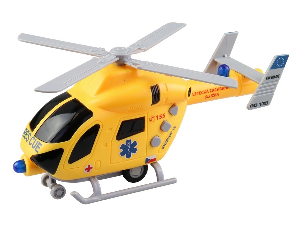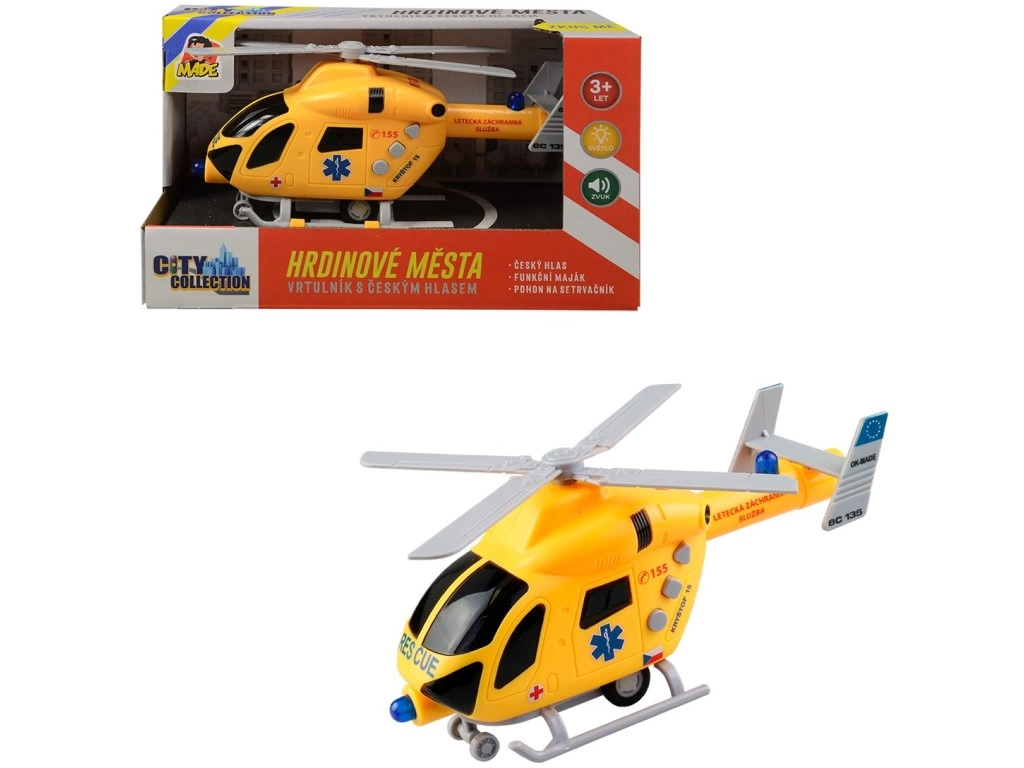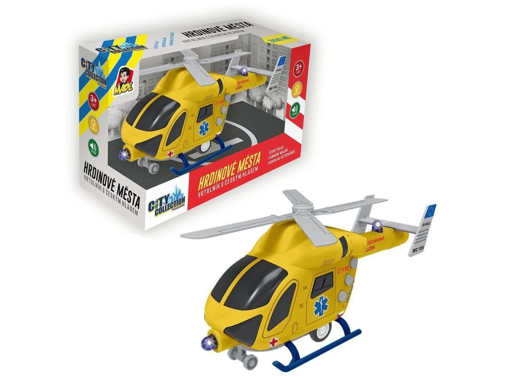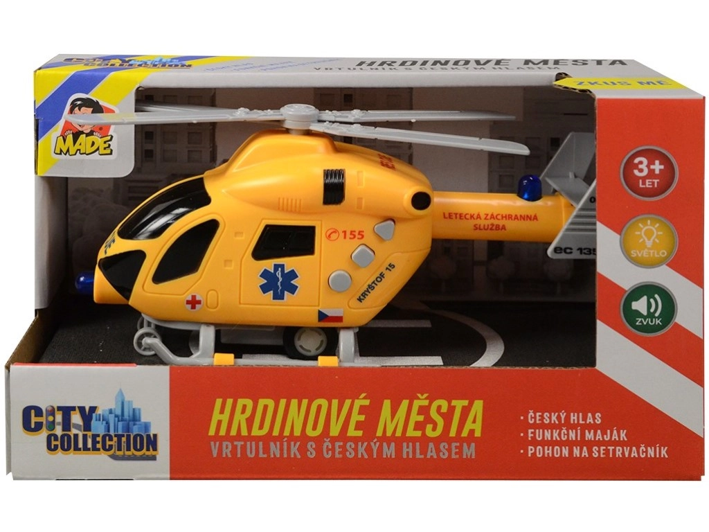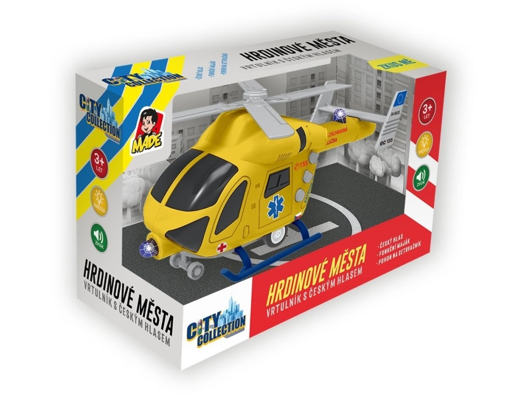 Спасителният хеликоптер от чешката марка MaDe впечатлява с реалистична изработка и чешки гласови ефекти. Благодарение на инерционния механизъм, светлинните ефекти и функциониращия маяк носи на децата от 3 години много динамично забавление. Батериите 3× AG13 са включени в опаковката.