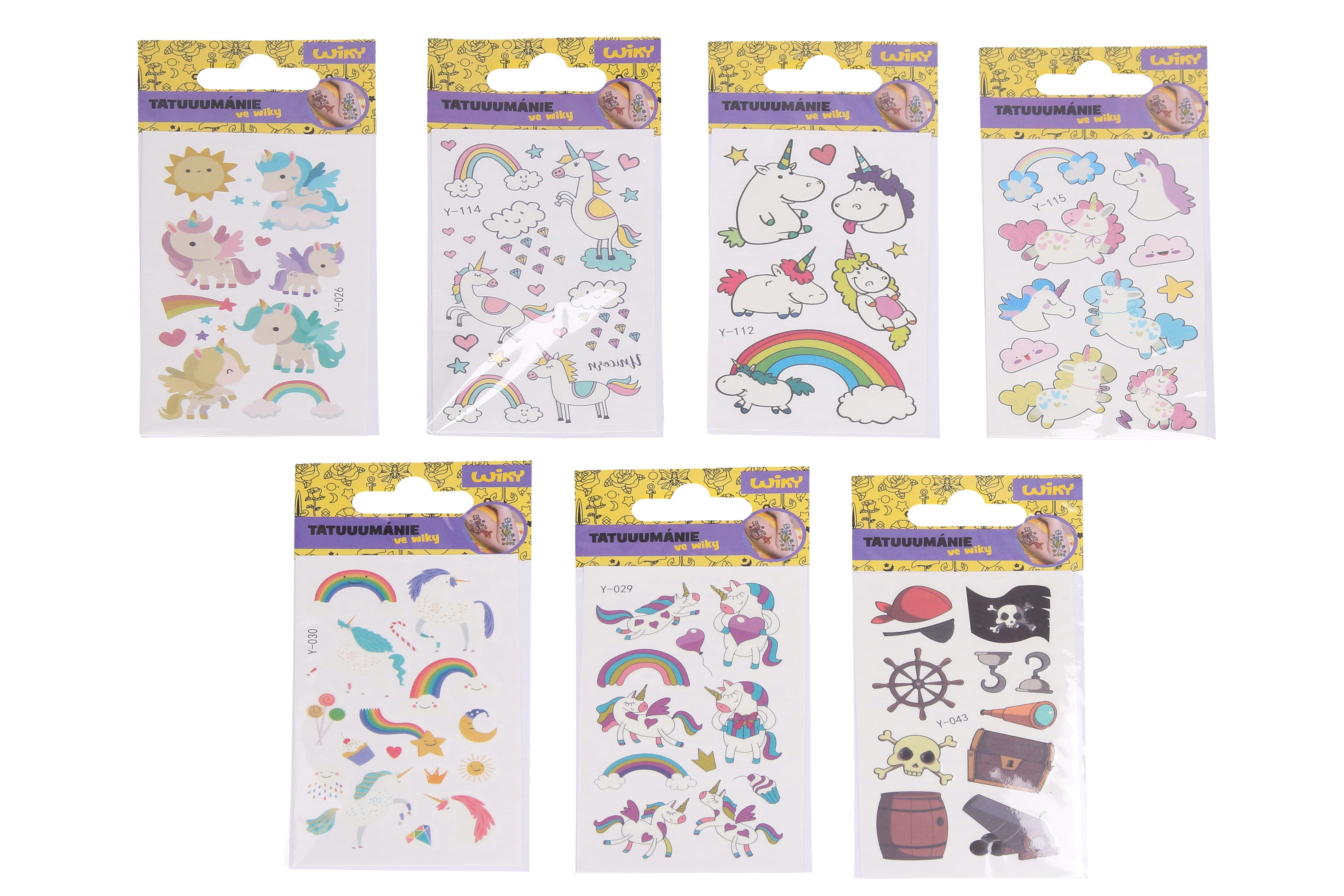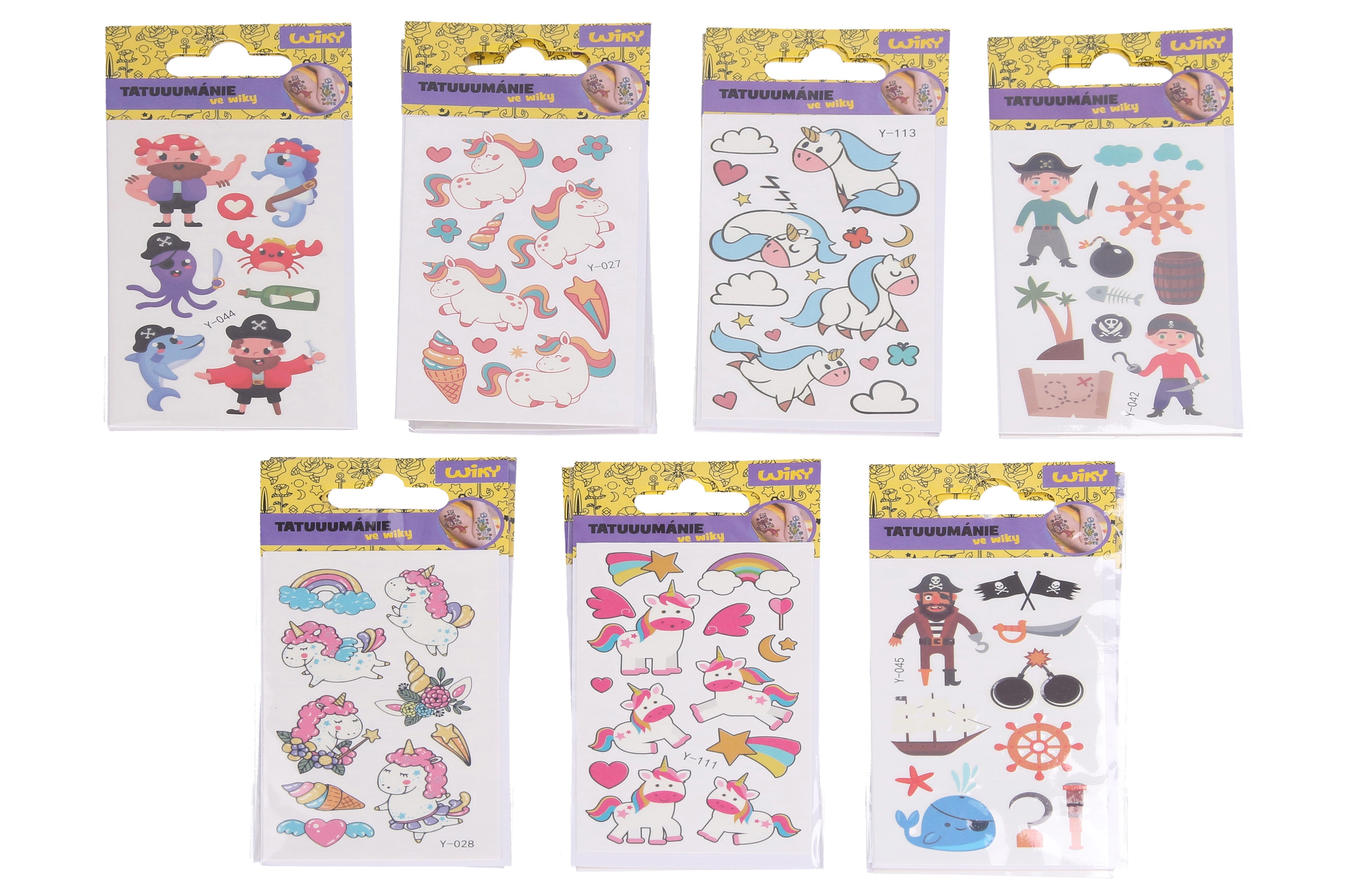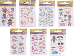 Забавни детски временни татуировки, които светят в тъмното, ще зарадват малките почитатели на фантазията и приключенията. Практичният формат 6 × 10,5 cm и големият микс от мотиви с еднорози и пирати са подходящи за празненства, подаръци и ежедневни игри.