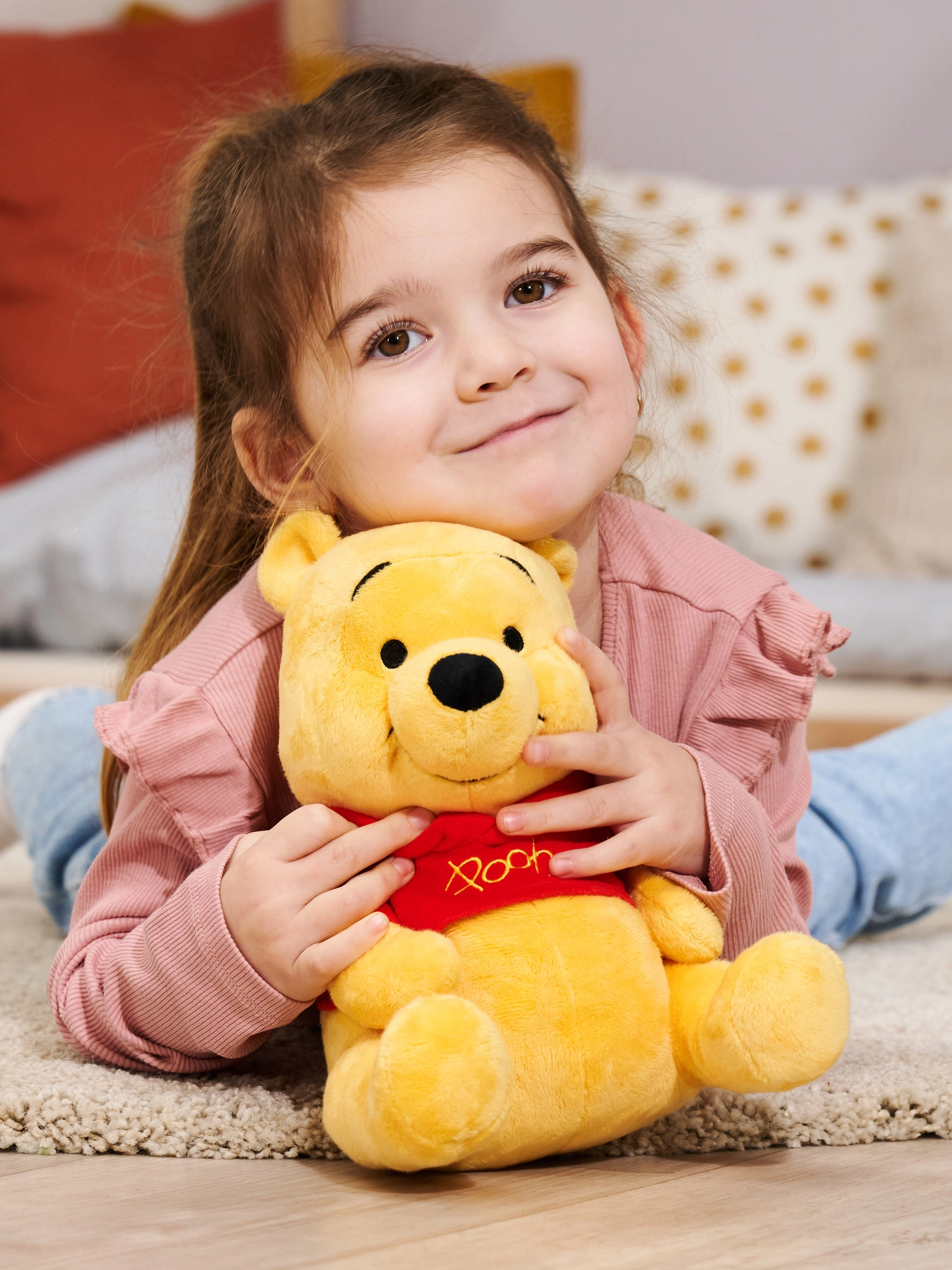 Тази официално лицензирана плюшена играчка DISNEY представя любимия герой WINNIE THE POOH в сладък и гушлив вариант. Мек плюш, прецизна изработка и безопасни везани елементи осигуряват комфорт и дълъг живот. Благодарение на компактните размери се носи лесно и се побира в количка, раничка и в детската стая.