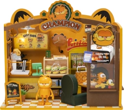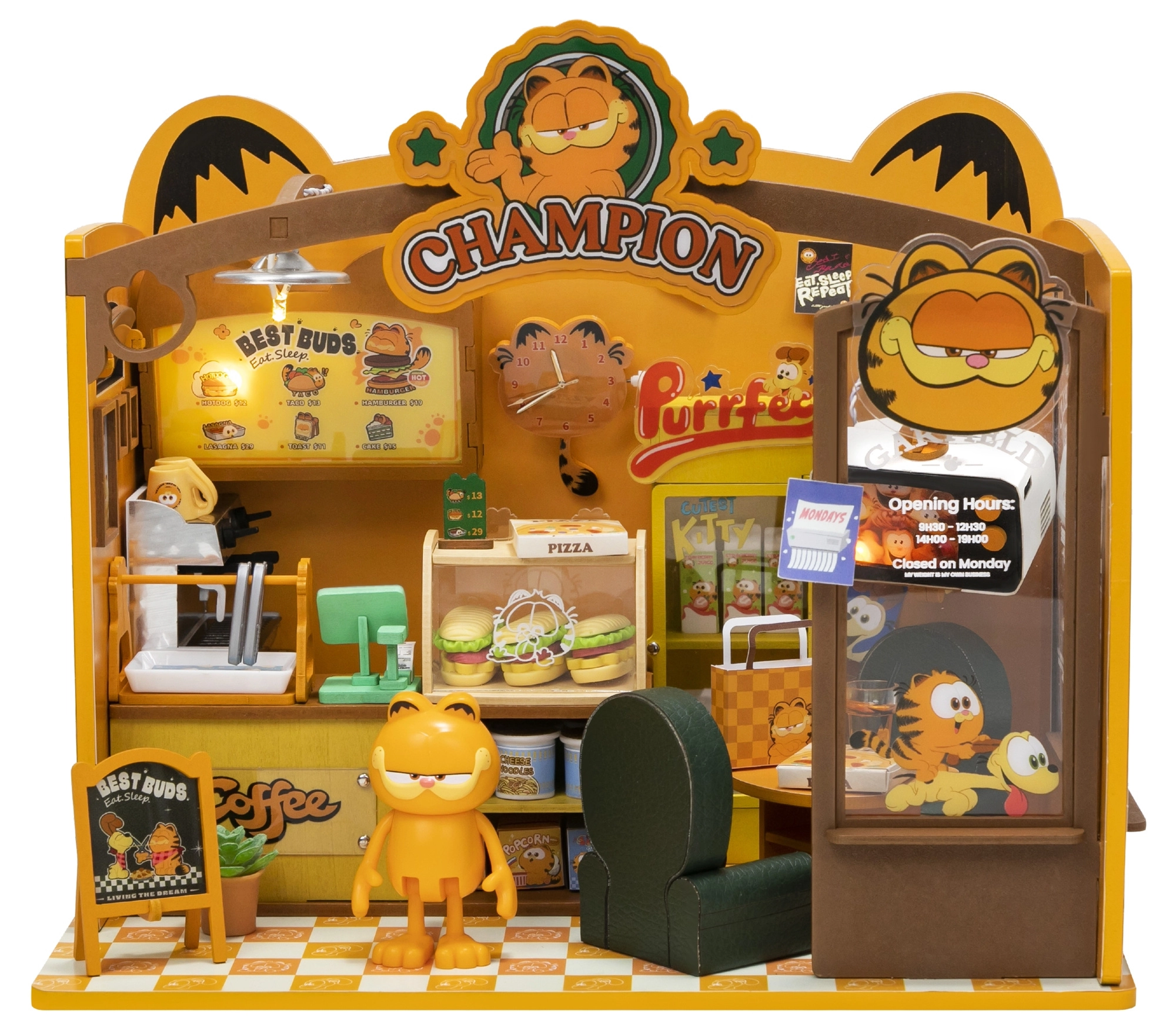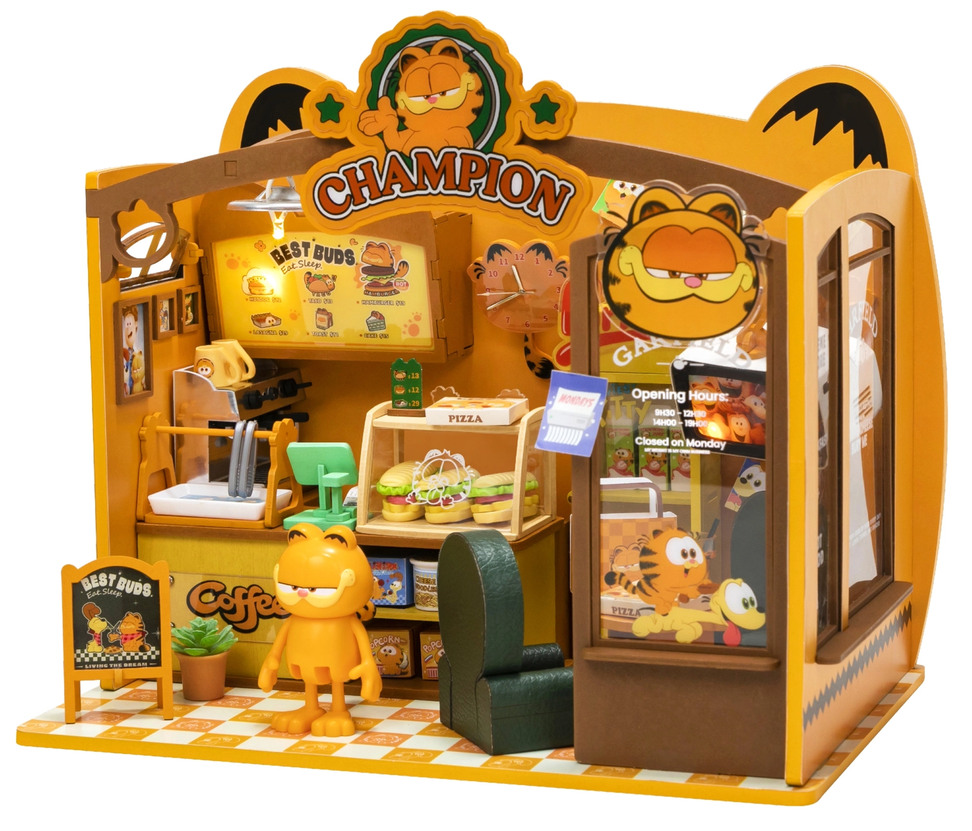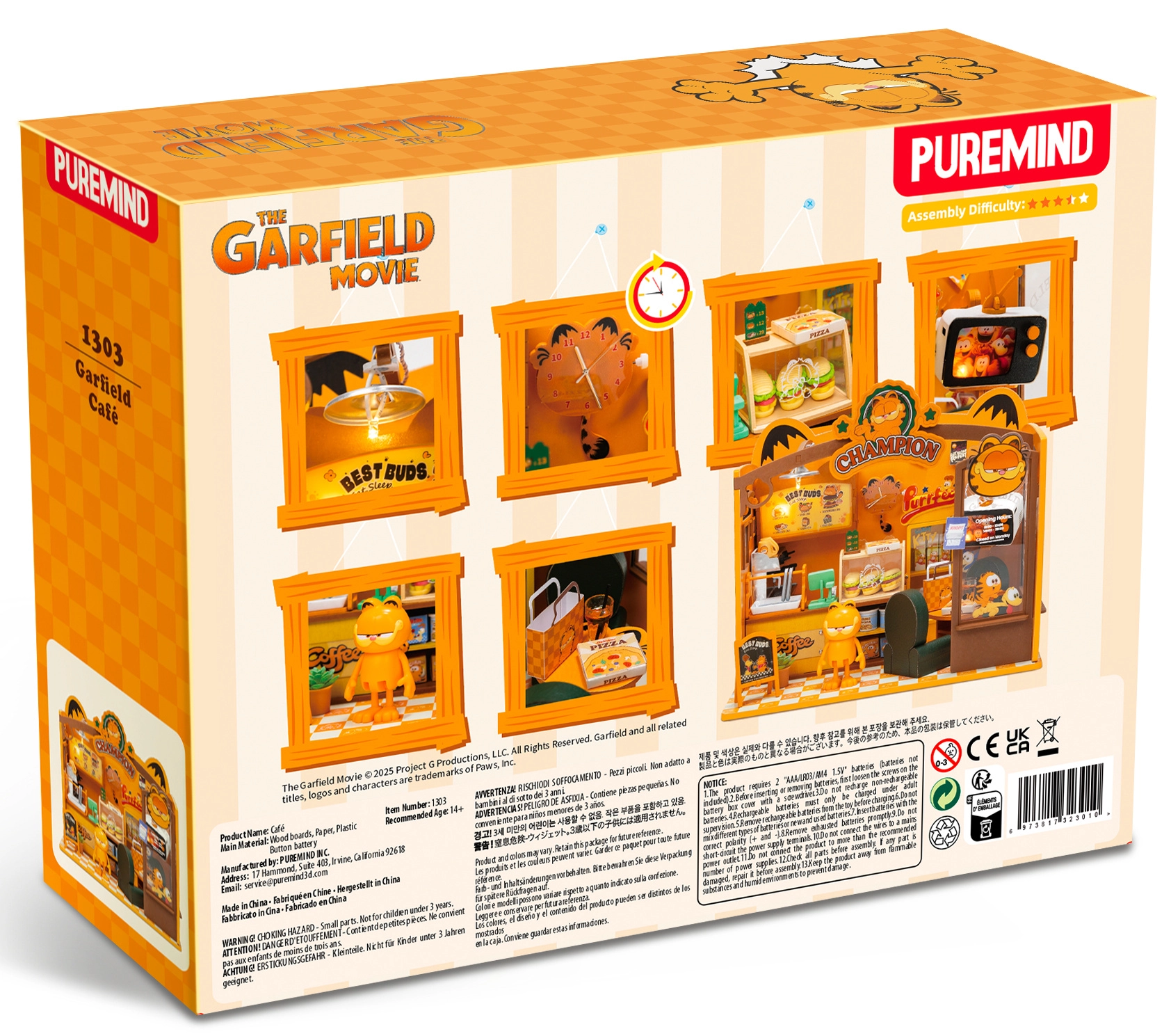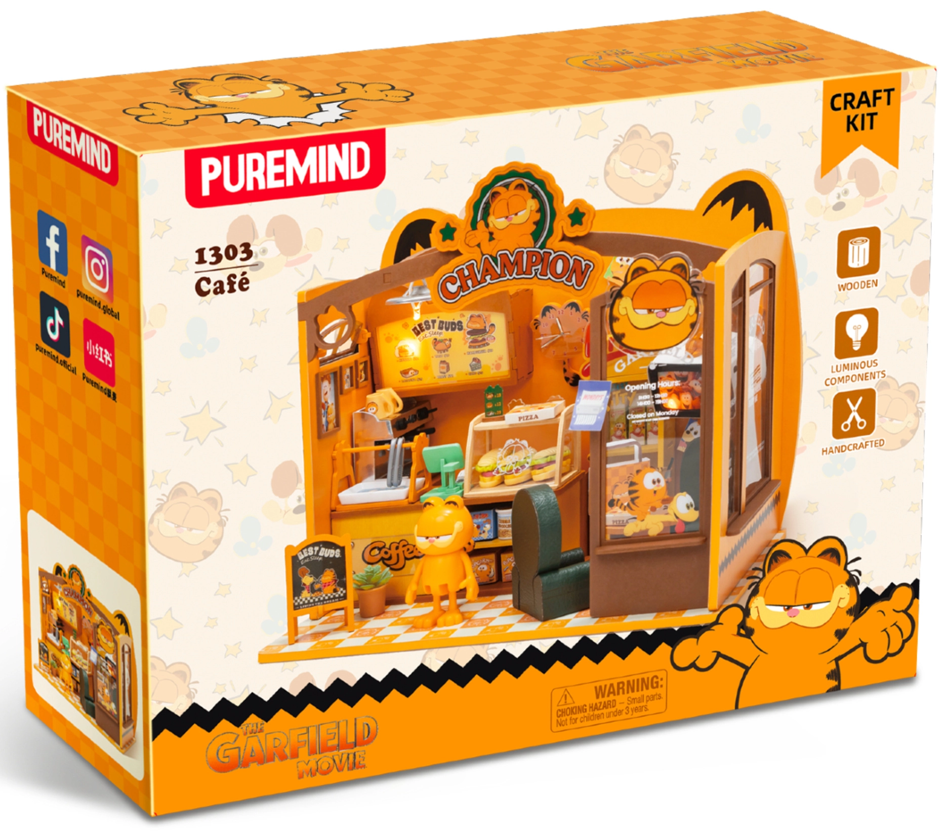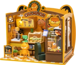 Този детайлен дървен комплект представя уютна сцена на кафене, вдъхновена от филма The Garfield Movie. Прецизно изрязаните елементи пасват точно един към друг и създават декоративен диорама модел с характерни интериорни детайли. Интегрираното LED осветление подчертава атмосферата и превръща готовия модел във впечатляващ акцент на рафт или работно бюро.