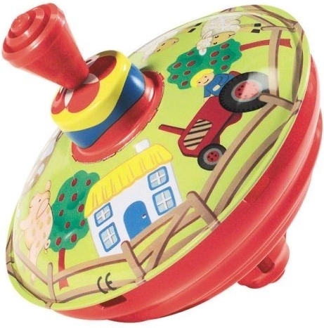 Тази традиционна въртележка с мотив „селски двор“ е идеалната играчка за най-малките. Простият механизъм с натискане на лостчето завърта въртележката, която при въртене издава характерен звук и осигурява визуални стимули.