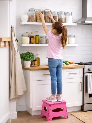 Идеална за деца до мивката, за лесно достигане до по-високи рафтове в кухнята или гардероба, като помощна седалка или практичен аксесоар за къмпинг и пътуване. Минималистичният дизайн и компактните размери пасват на всеки интериор.