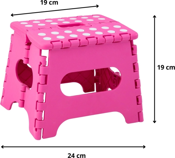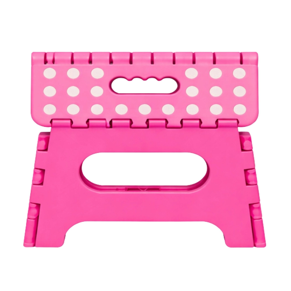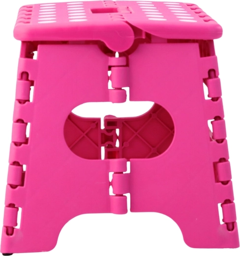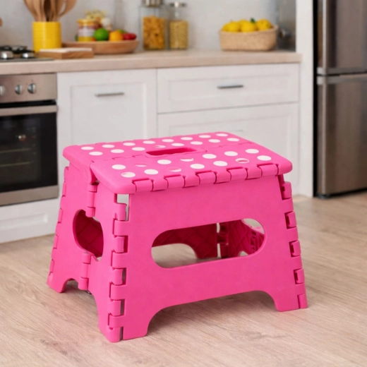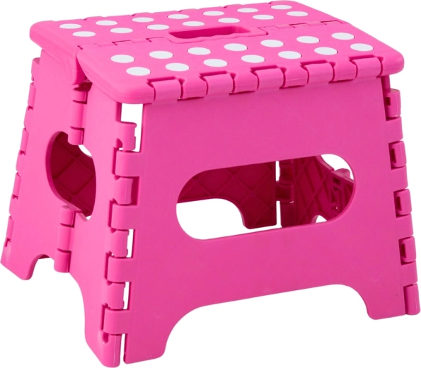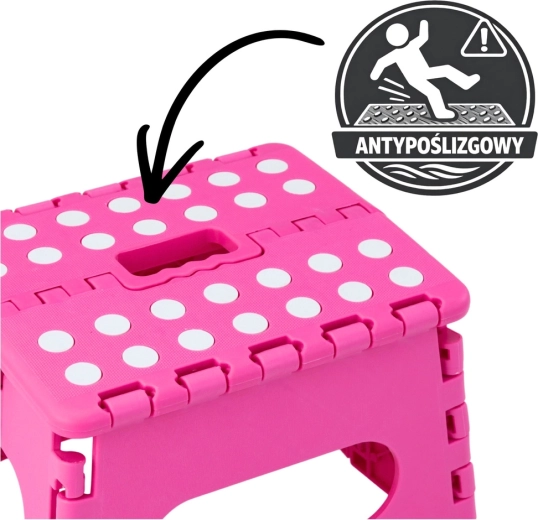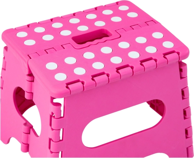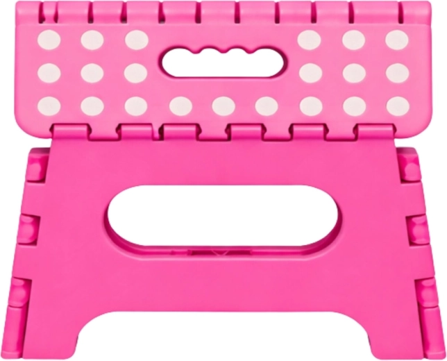 Розовата сгъваема стъпка е изработена от издръжлива пластмаса, която осигурява здравина и дълъг живот. Противоплъзгащата горна повърхност с точки повишава безопасността при употреба, дори във влажна среда. Вградената дръжка позволява бързо пренасяне и лесно сгъване до плоска форма за компактно съхранение.