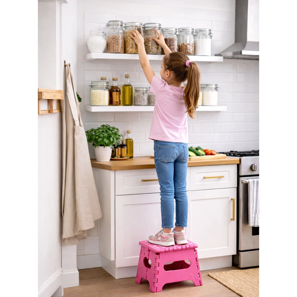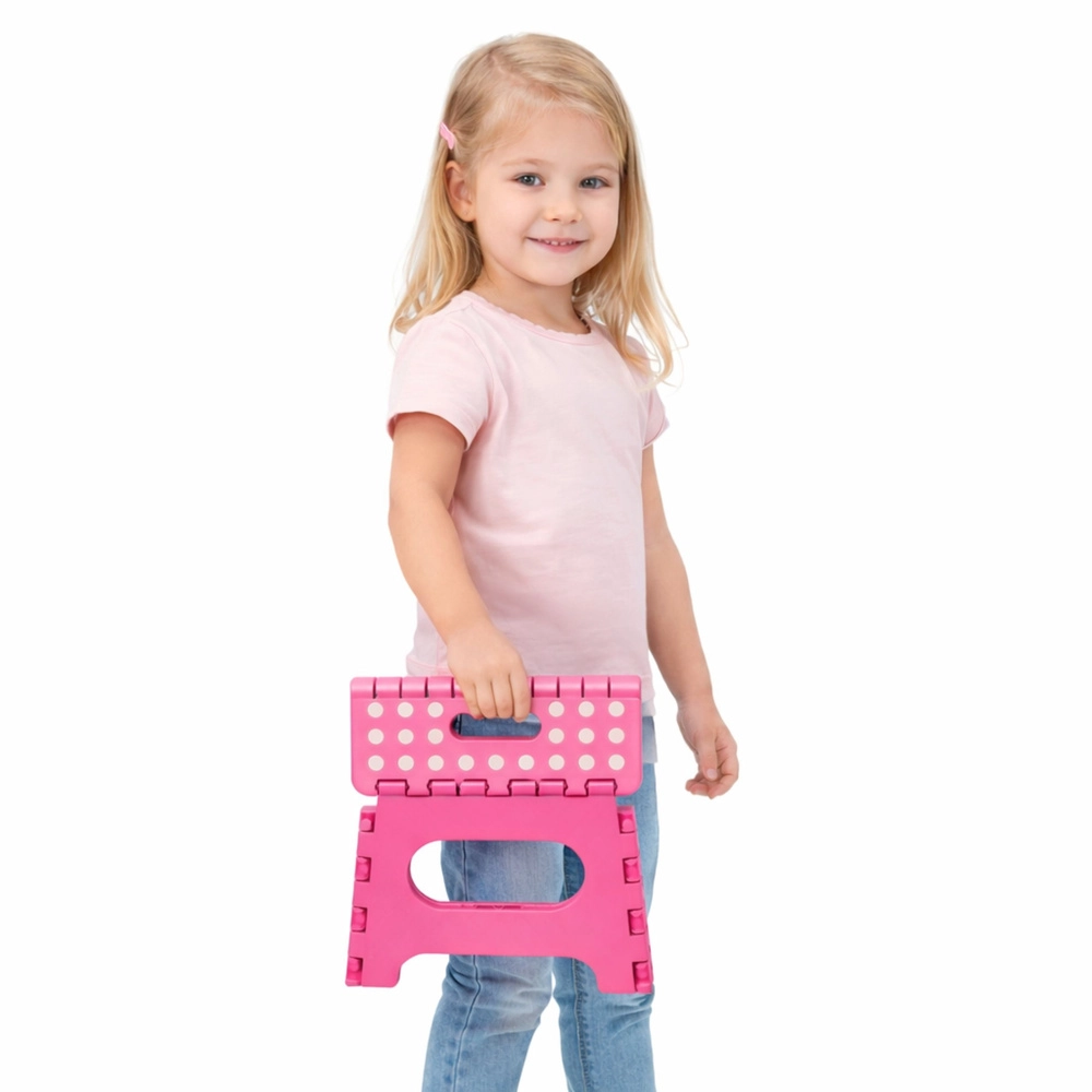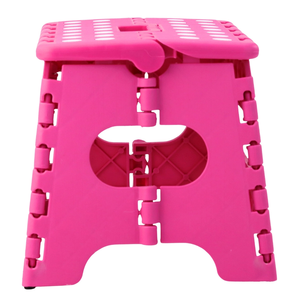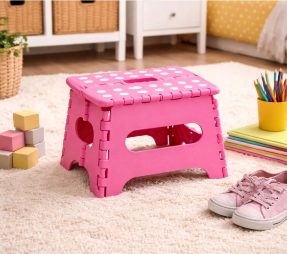 Розовата сгъваема стъпка е изработена от издръжлива пластмаса, която осигурява здравина и дълъг живот. Противоплъзгащата горна повърхност с точки повишава безопасността при употреба, дори във влажна среда. Вградената дръжка позволява бързо пренасяне и лесно сгъване до плоска форма за компактно съхранение.