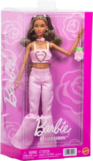 Тази модна кукла носи свеж fashion стил, вдъхновен от най-новите тенденции. Тоалетът включва къс топ със сърчице и дълги клош панталони с розов десен. Визията се допълва от розова чанта във формата на роза, колие с мотив роза и ефектни обеци – всичко хармонично съчетано в единна, впечатляваща стилизация.