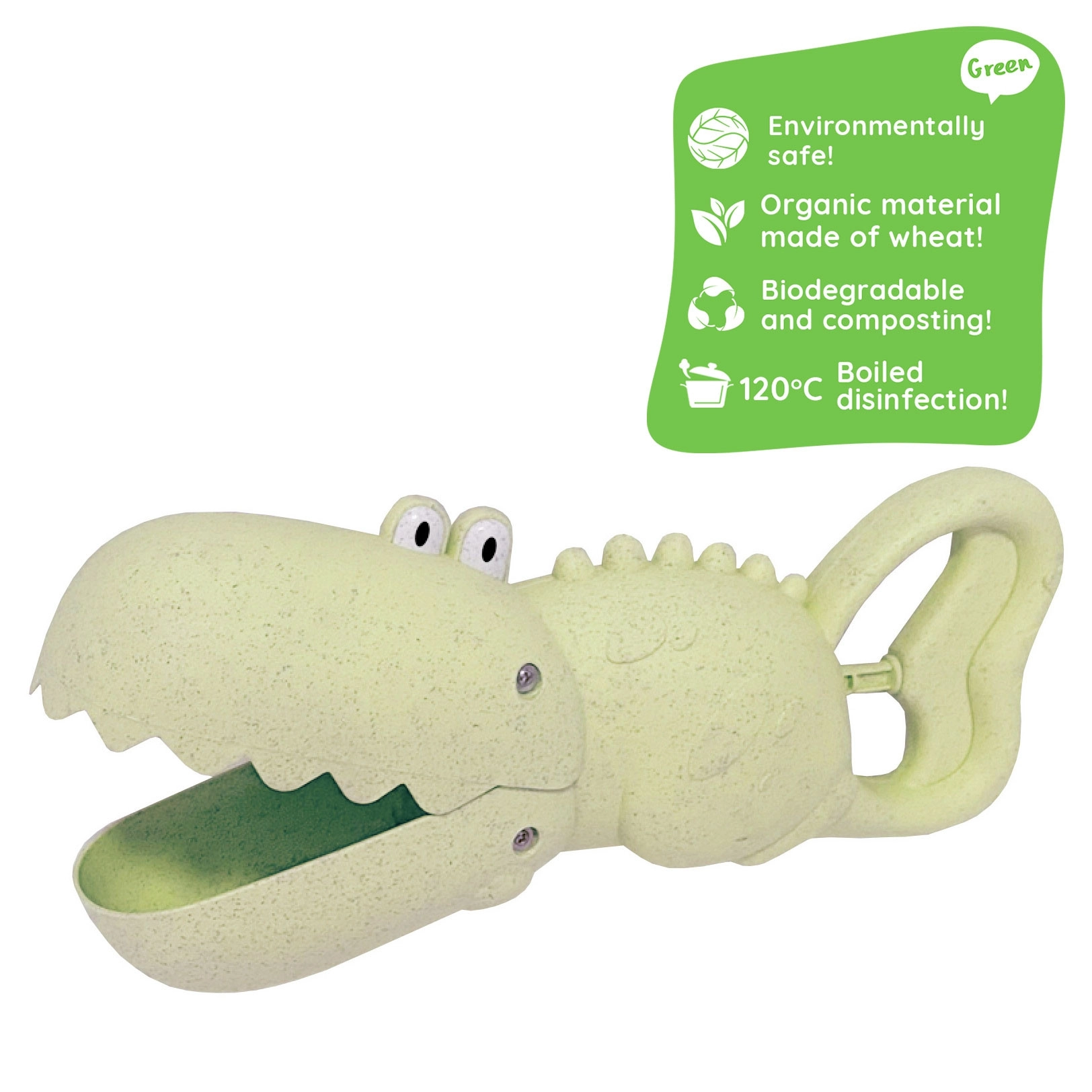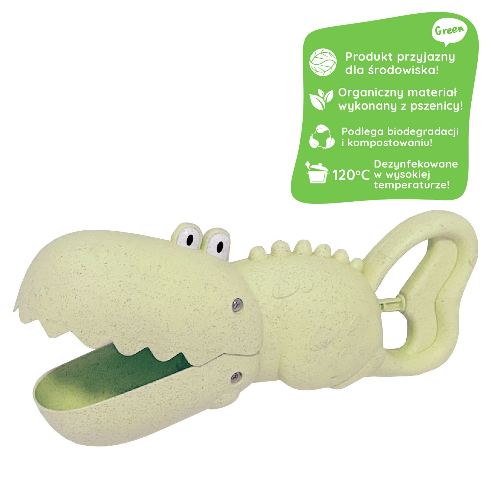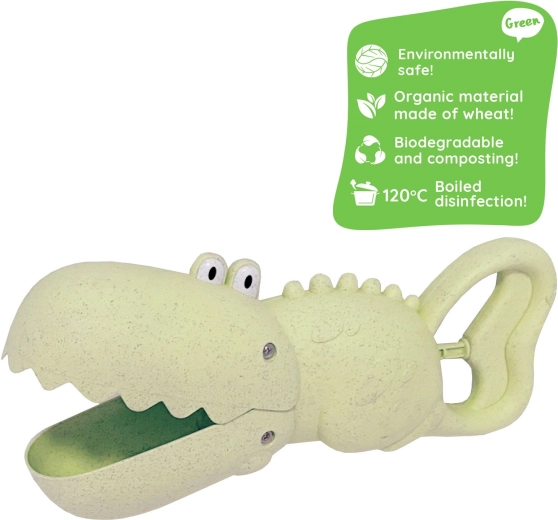 Открийте забавна и екологична лопатка във форма на крокодил, която ще очарова всеки малък строител на пясъчни замъци. Благодарение на умната форма лесно загребва, пренася и излива пясък и вода и изпълнява ролята на лопатка и кофче в едно. Идеална за площадката, пясъчника, плажа и градината.