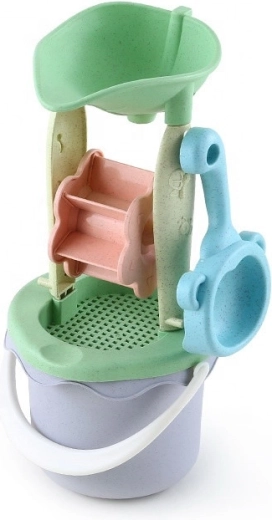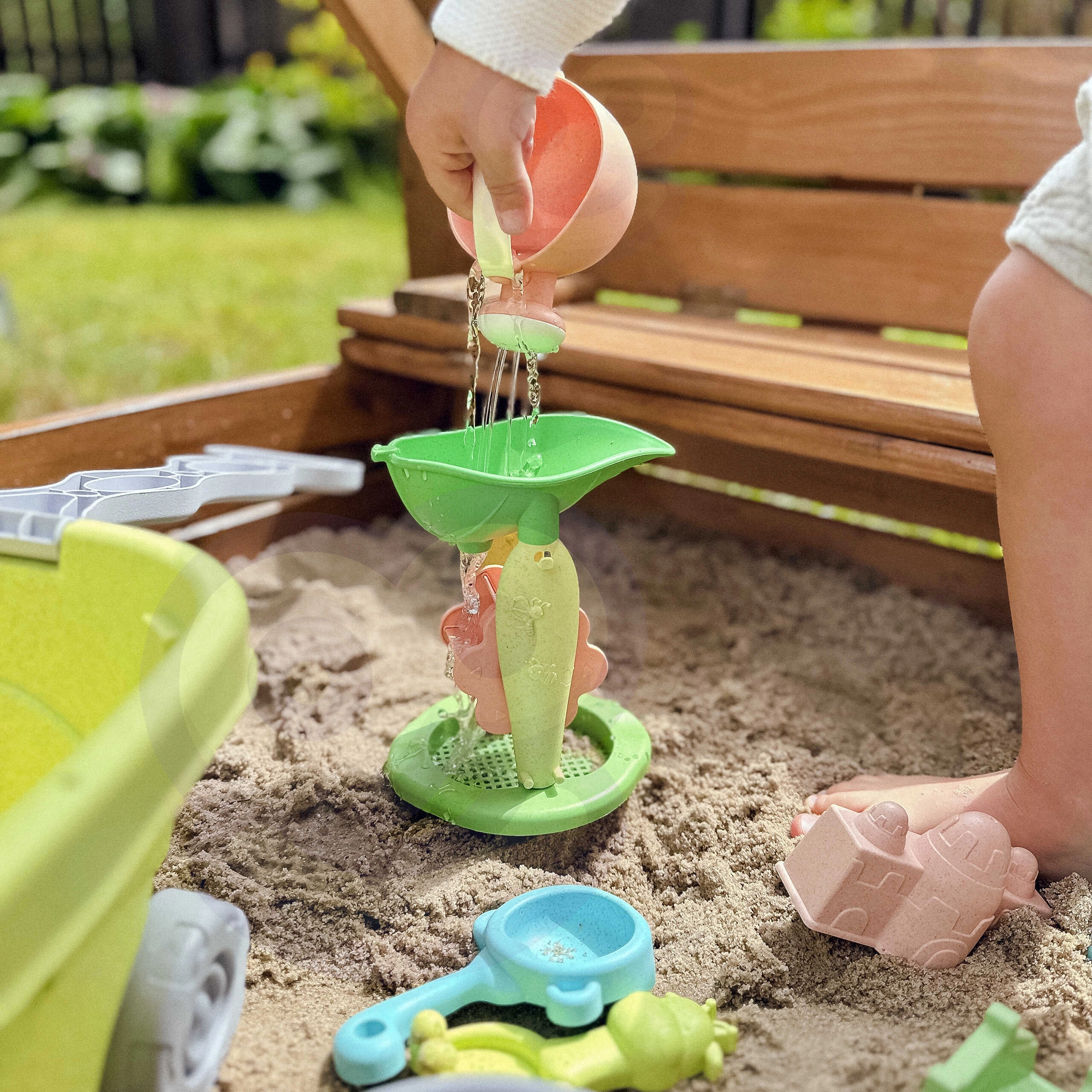 Изсипете пясък или вода във фунията и наблюдавайте как се завъртат колелцата. Вграденото сито помага за пречистване на пясъка и добавя забавен елемент на експериментиране.