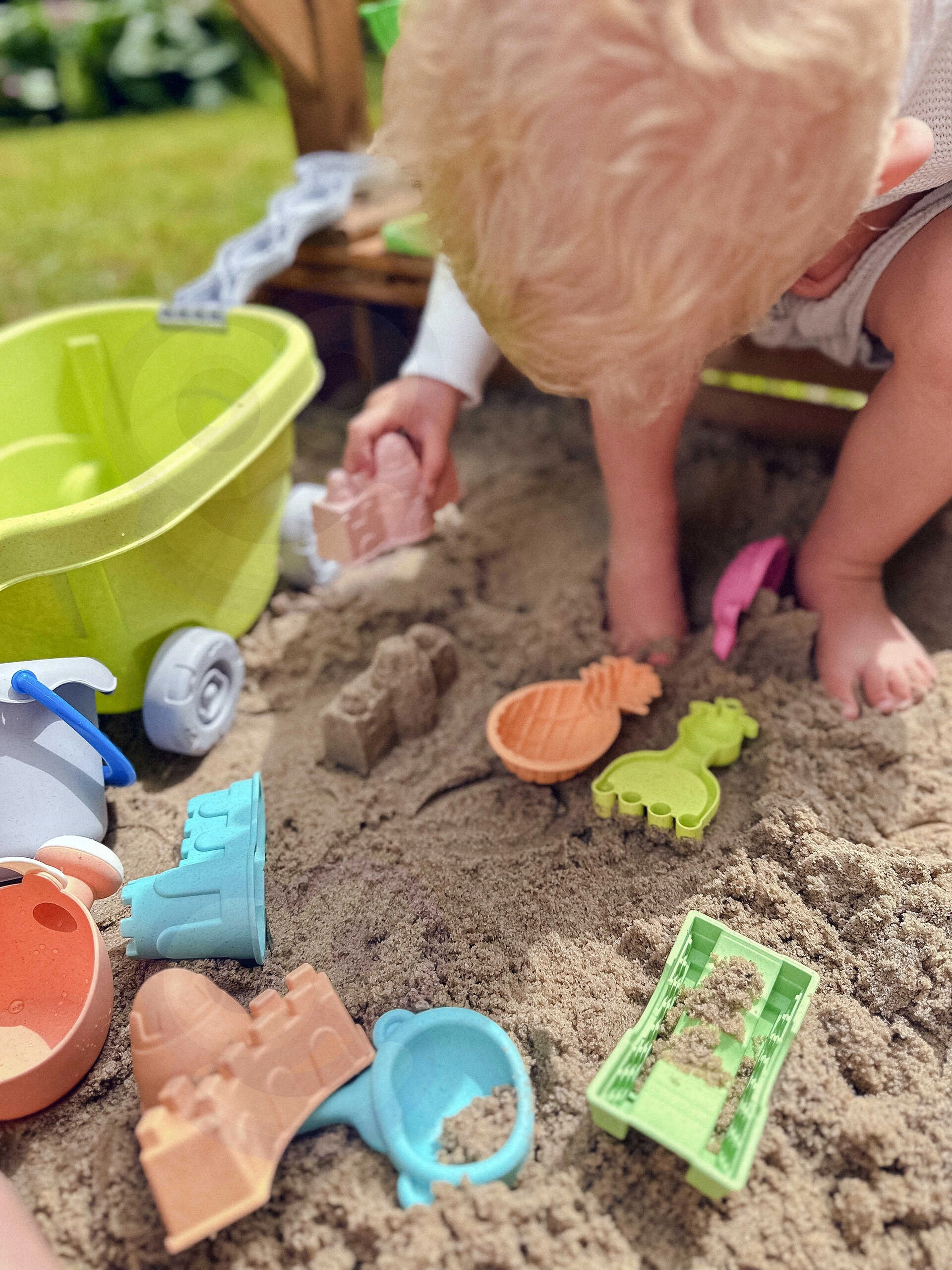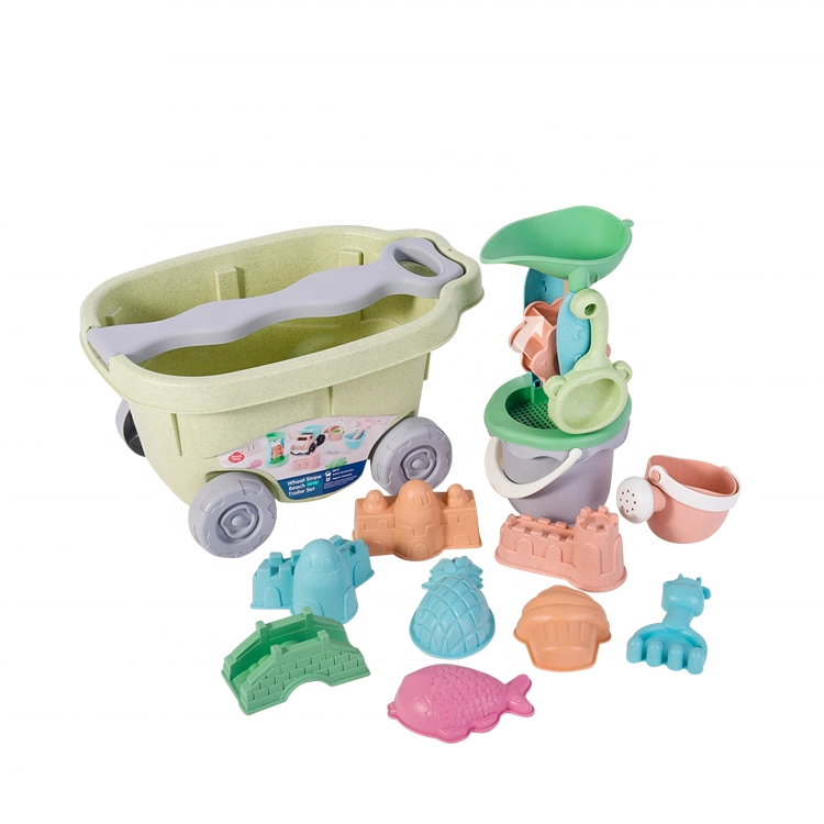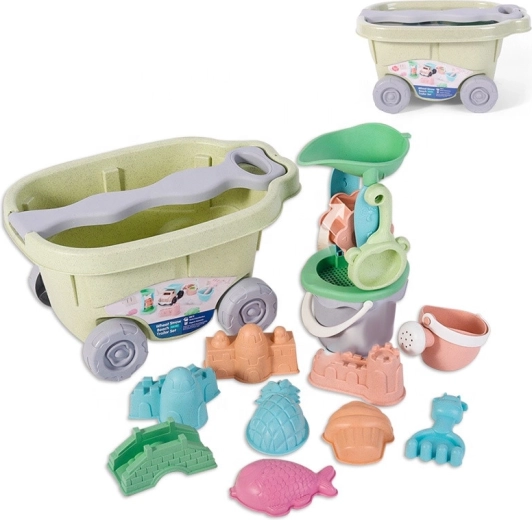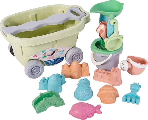 Този 13‑частен комплект за пясък с практична количка ще зарадва всеки малък строител. Децата могат да пренасят пясък, да пресяват, да отливат форми и да завъртят водната/пясъчната мелничка. Благодарение на удобните дръжки на кофичката и лейката боравенето е лесно дори за малки детски ръчички.