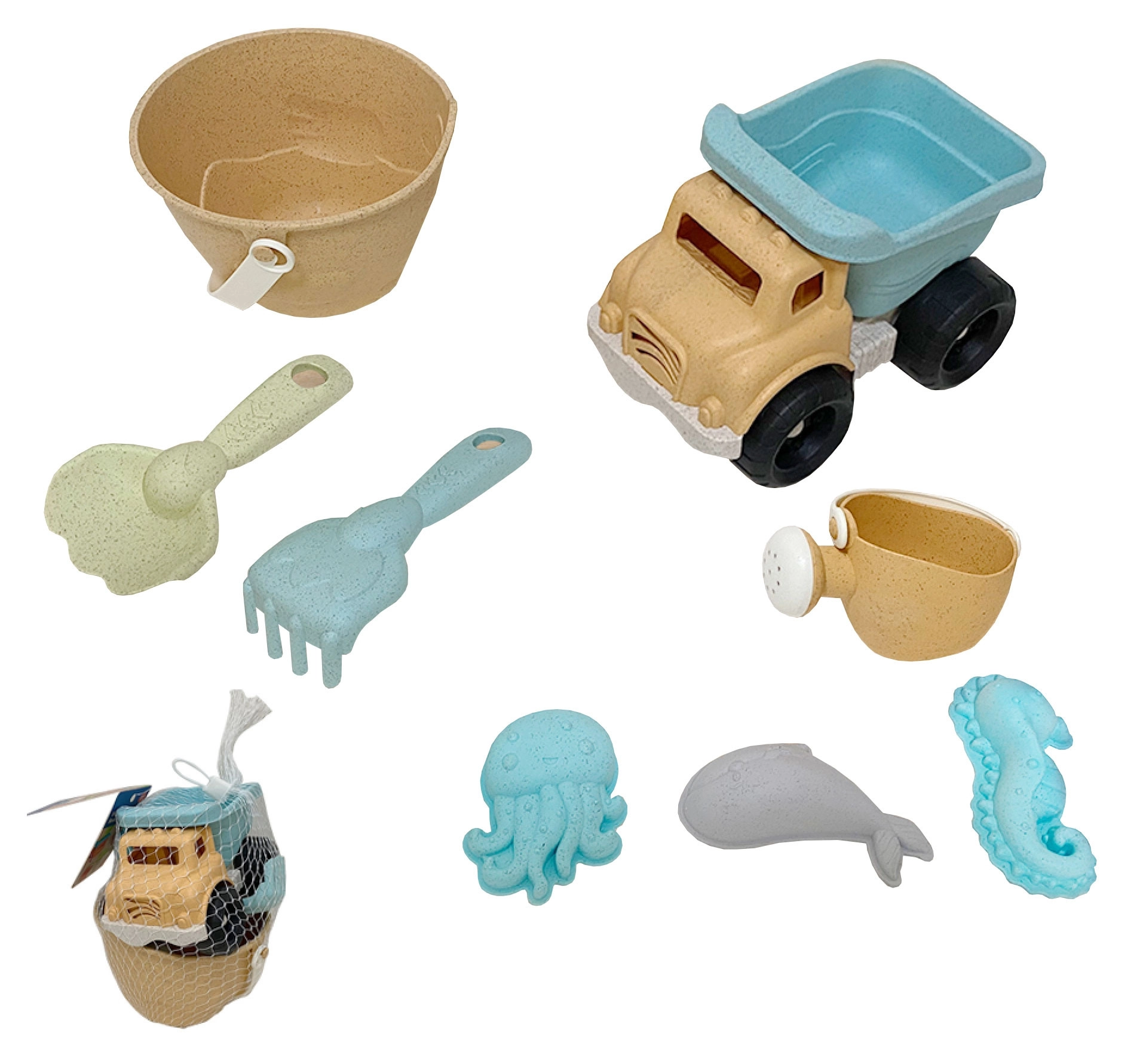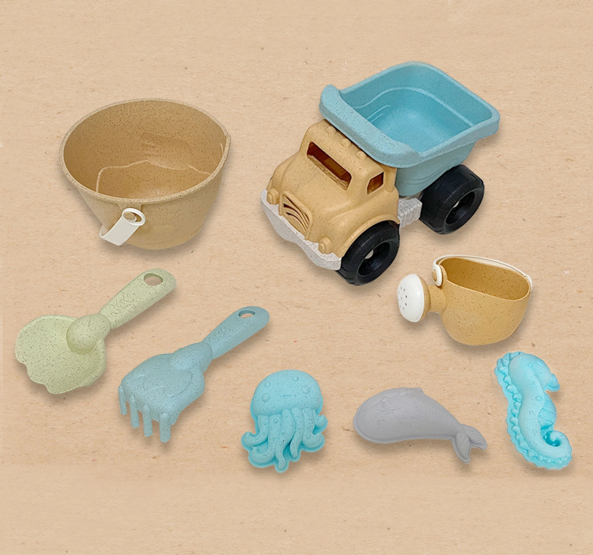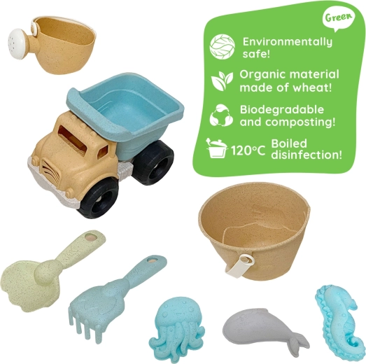 Комплектът за пясък WOOPIE GREEN носи на децата часове творческа игра, а на родителите спокойствието на щадящ избор. Продуктът е изработен от органичен, екологичен материал на основата на пшенични влакна, който се естествено разгражда в почвата и е компостируем. Пастелните цветове и ергономичните форми подпомагат приятно и безопасно играене.