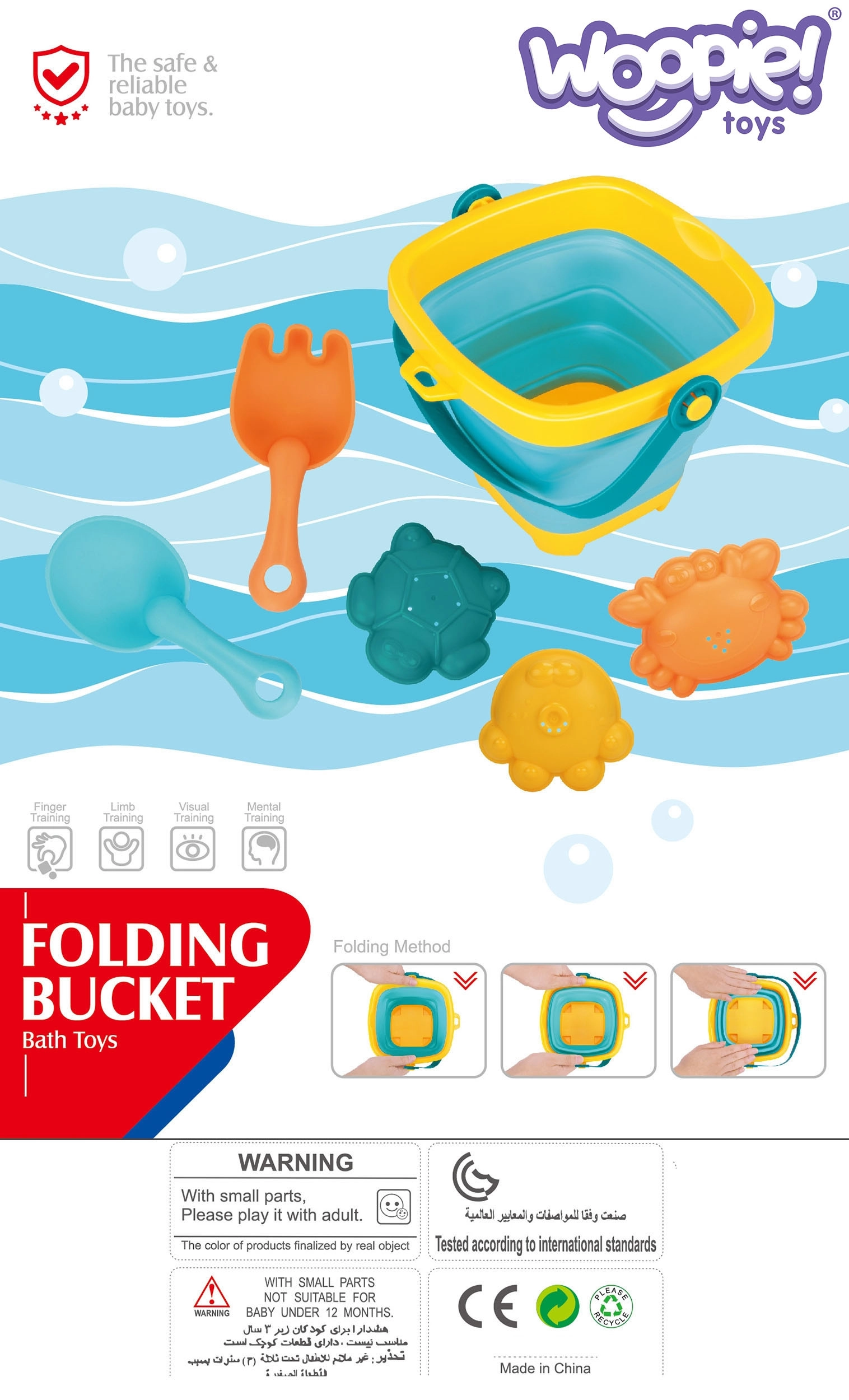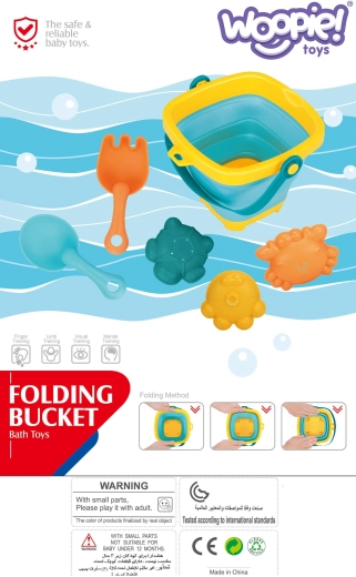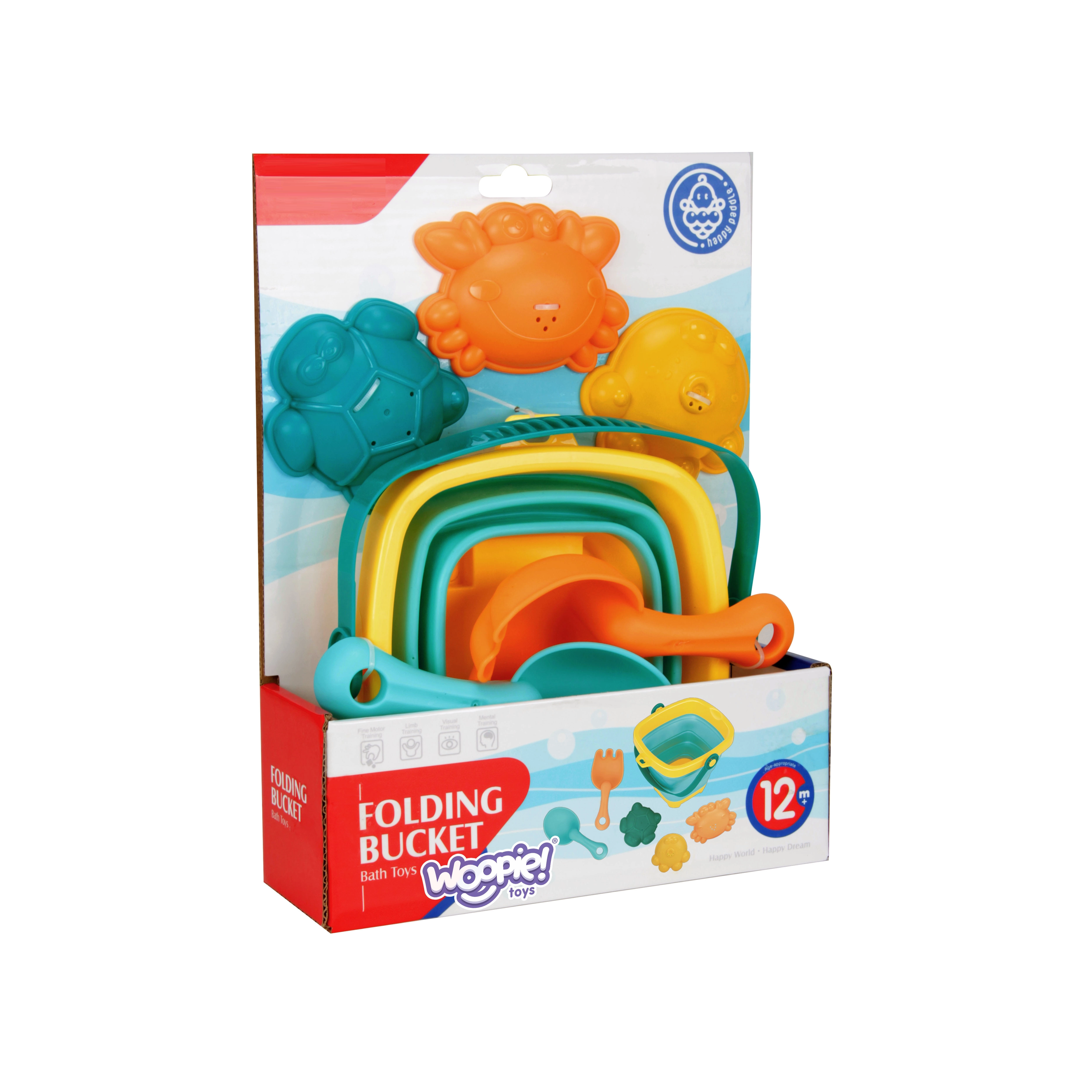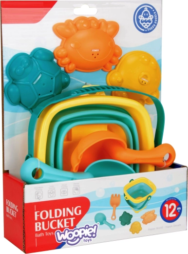 С този пъстър комплект WOOPIE децата ще се забавляват безкрайно край водата и в пясъка. Сгъваемият силиконов кош с пластмасов ръб и дъно се сплесква за миг до нисък профил, така че заема почти никакво място и лесно влиза във всяка чанта. Гъвкавите инструменти и формички са по-устойчиви на напукване и удобни за малките детски ръце.