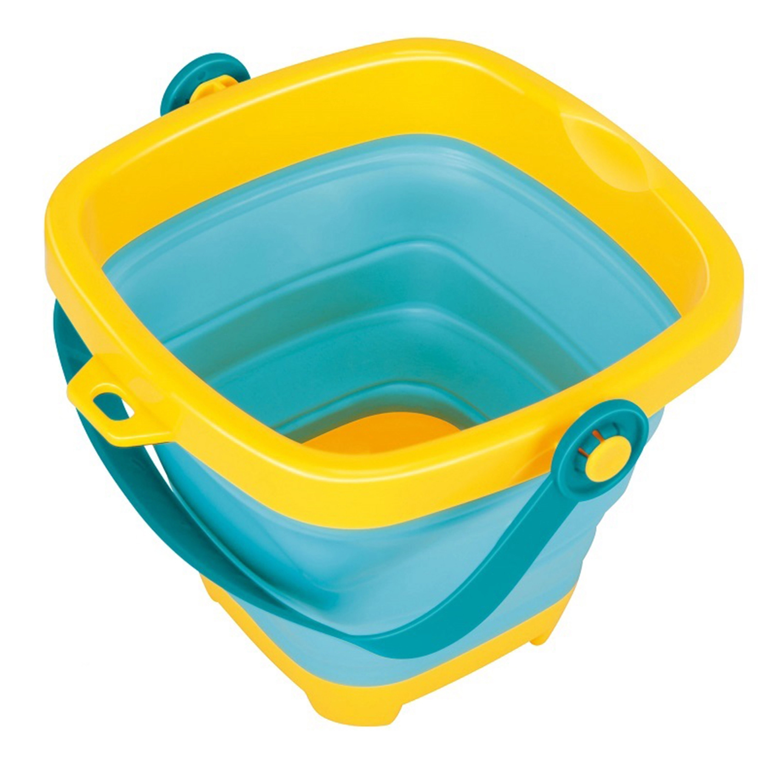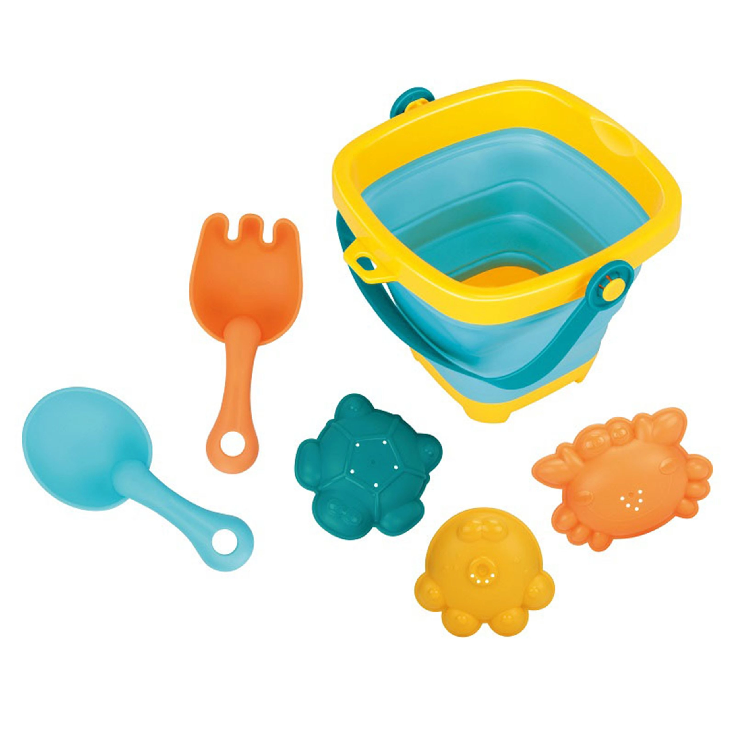 Практичен комплект за пясък и плаж за деца от 12 месеца: сгъваем силиконов кош с пластмасов ръб и дръжка, лопатка, гребло и три формички. Благодарение на хармониковото сгъване кошът спестява място, лесен е за пренасяне и е идеален за раничка, количка или плажна чанта. Издръжливите и гъвкави части са чудесни за пясъчника, плажа и градината.