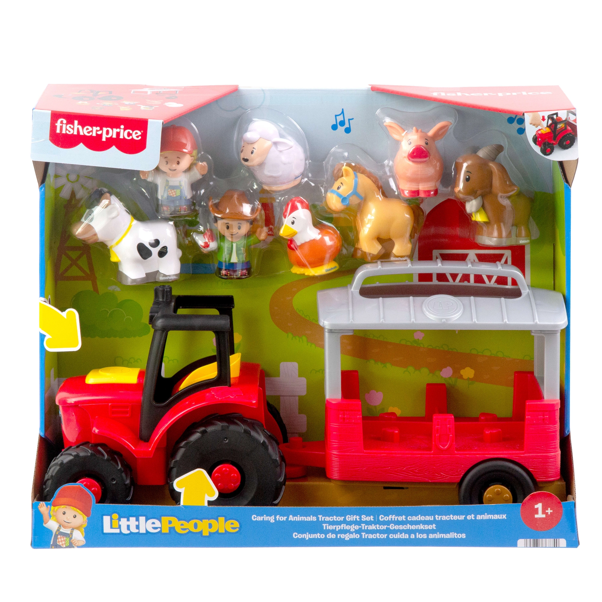Част от комплекта са 2 фигурки фермери и 6 животни (прасенце, овчица, конче, кравичка, кокошка и козичка). Ремаркето побира до 4 фигурки и се откача лесно, така че децата могат да сменят сценките, да превозват животни и да създават собствени истории. Всички части са с идеален размер за малки детски ръце и са проектирани за безопасна игра от най-ранните стъпки.
