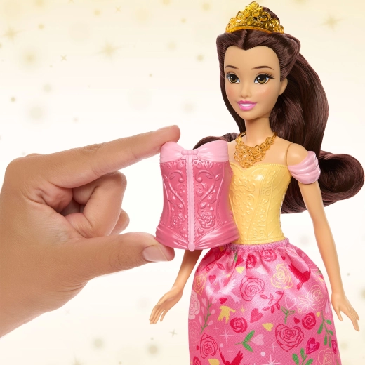 Куклата предлага лесна промяна на визията – просто сменете корсета и полата и следобедната среща мигом се превръща в вълшебен бал. Дългата коса може да се разресва и украсява с диадема, аксесоарите насърчават ролевата игра, а благодарение на ставните точки Бел красиво позира във всяко приключение.