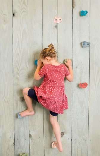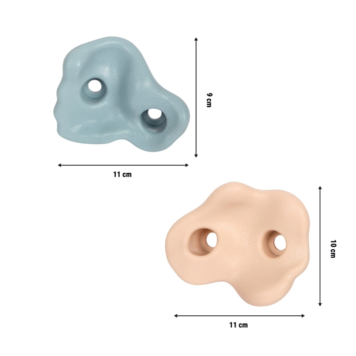 Създайте за децата безопасно и мотивиращо трасе за катерене. Здравите пластмасови хватки в модерни цветове имат приятно зърнеста повърхност за сигурен захват дори с малки ръчички. 2-точково закрепване осигурява стабилност без завъртане и позволява здрав монтаж върху дървени плоскости, игрови кули и градински стени.