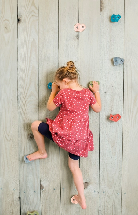 Благодарение на свободното разположение лесно регулирате трудността – от прости начинаещи линии до по-взискателни предизвикателства за малки боулдъристи. Катеренето естествено развива сила, издръжливост, координация и самоувереност и подпомага здравословното моторно развитие на децата.