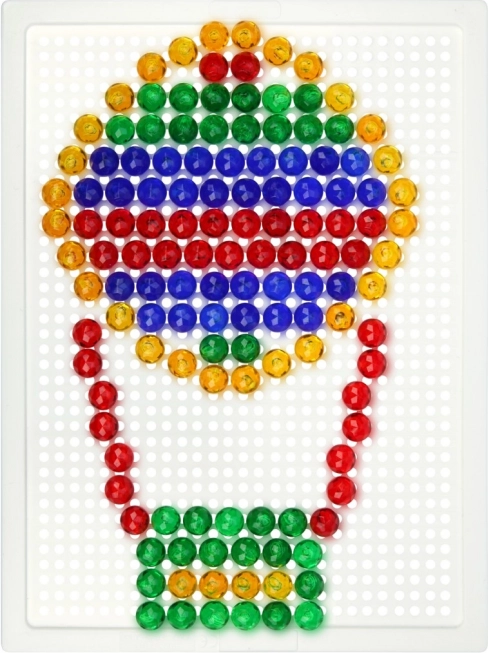 Тази кристална мозайка е идеален избор за първи творчески стъпки. Благодарение на прозрачните цветни габърчета върху бялата подложка се получават ярки и игриви картинки. Децата упражняват търпение, координация око–ръка и се учат да разпознават цветове и форми.