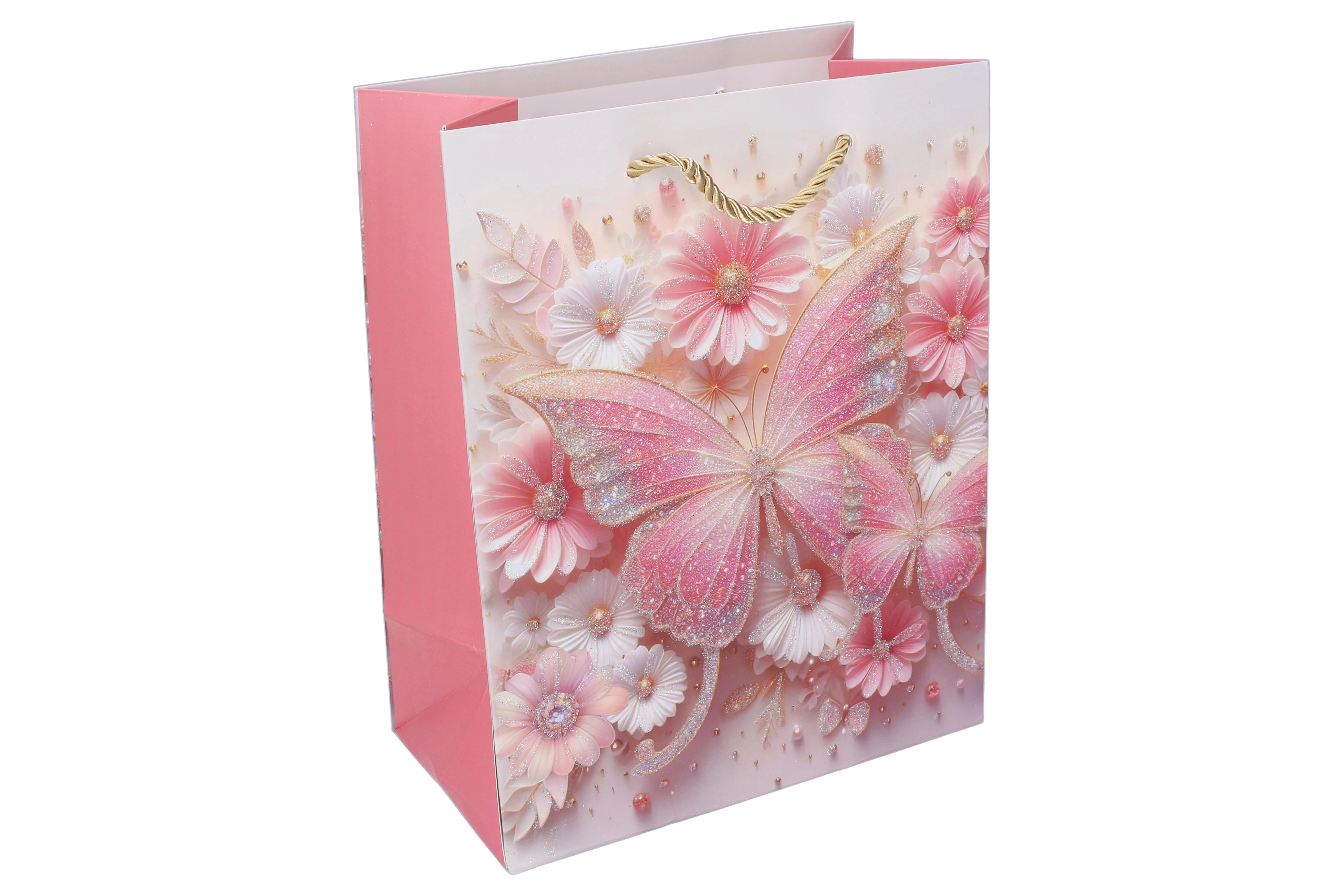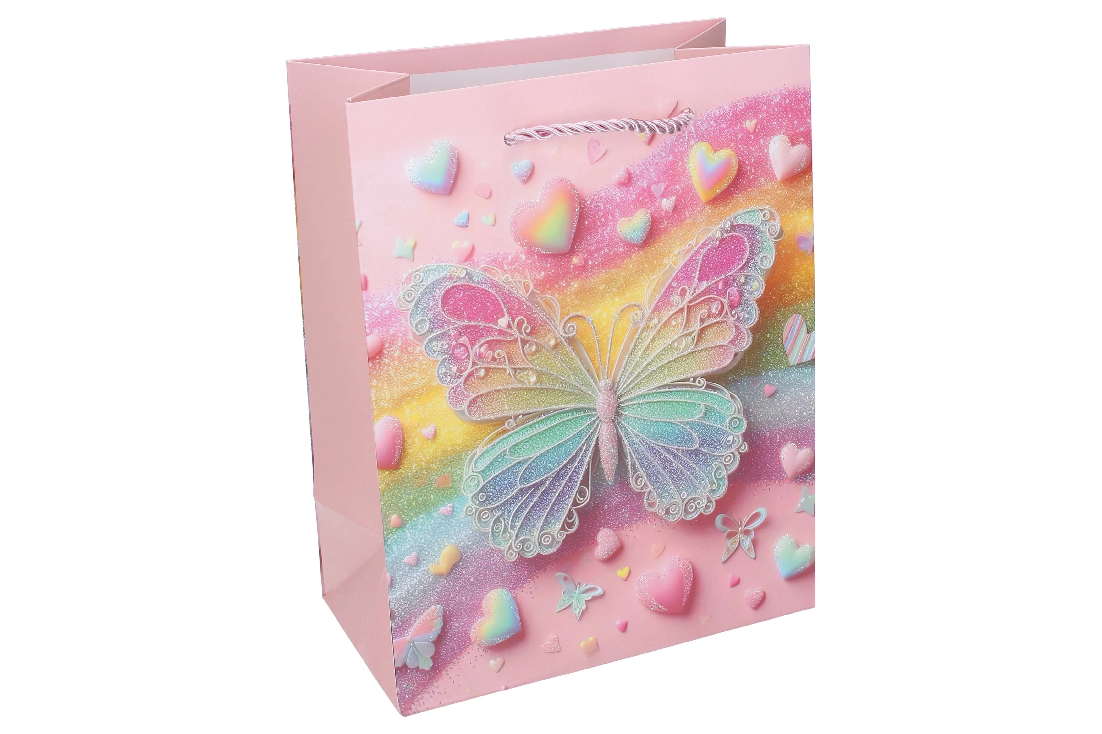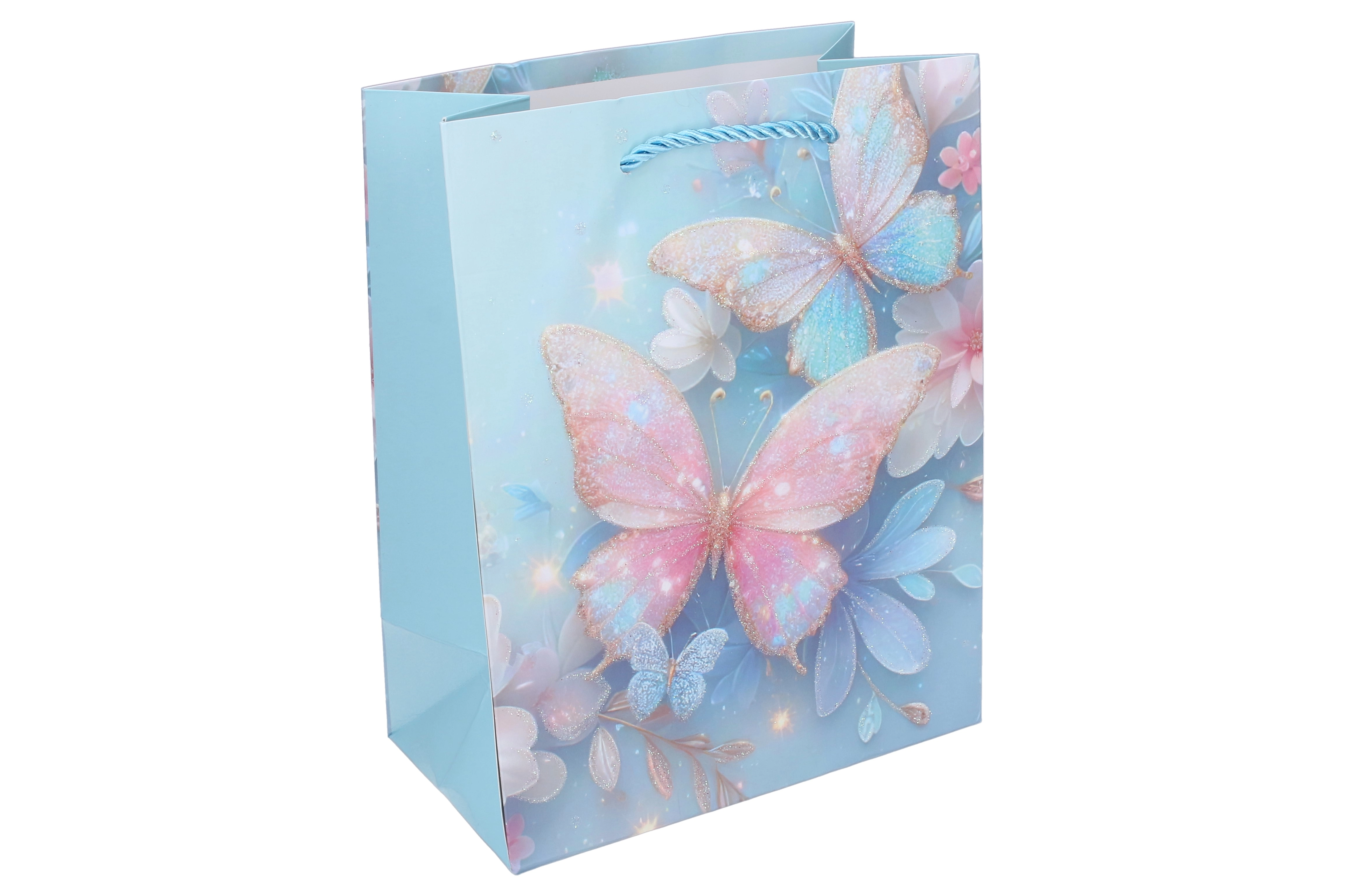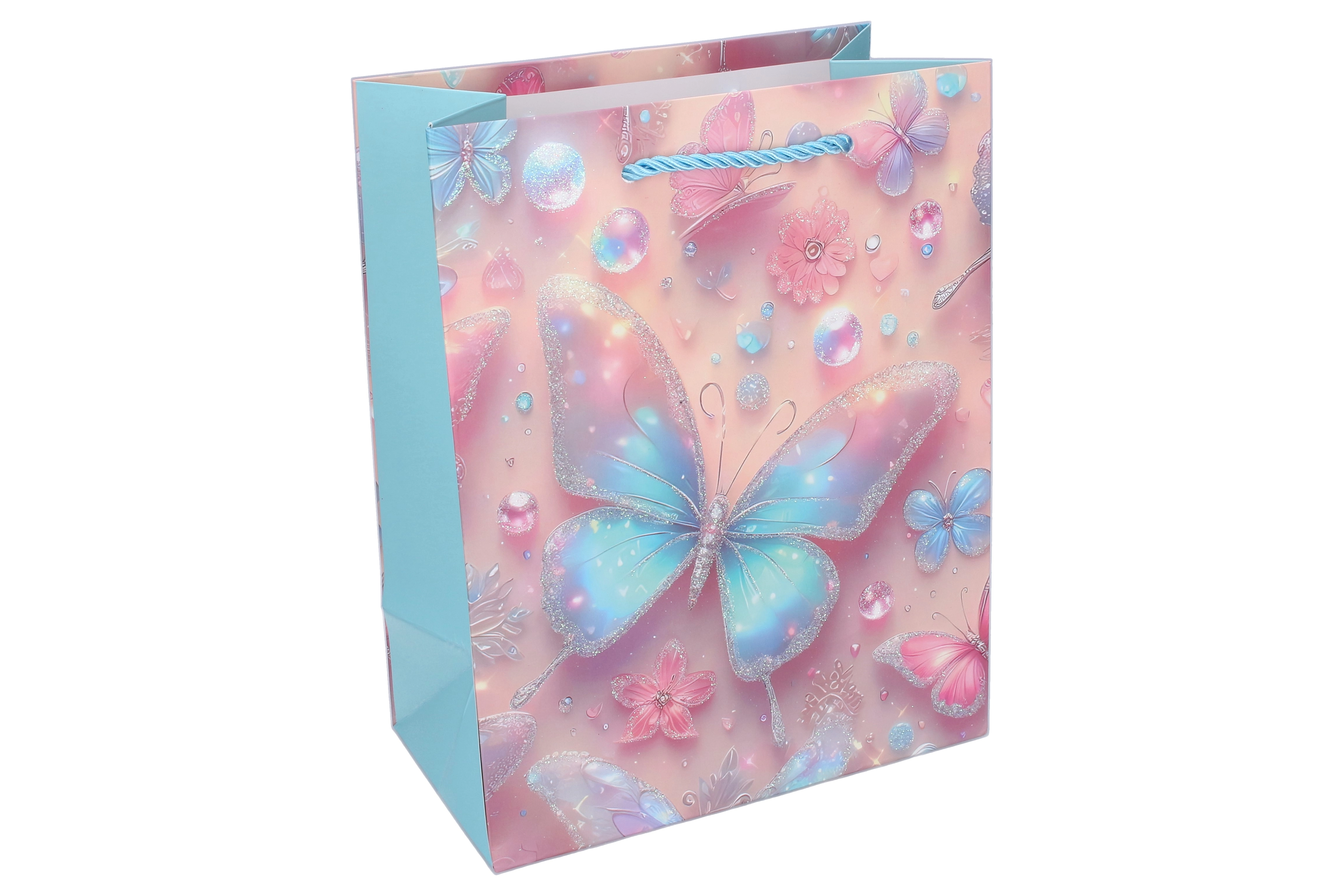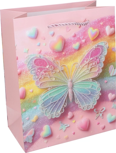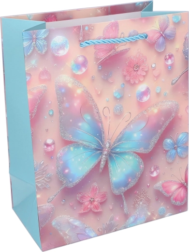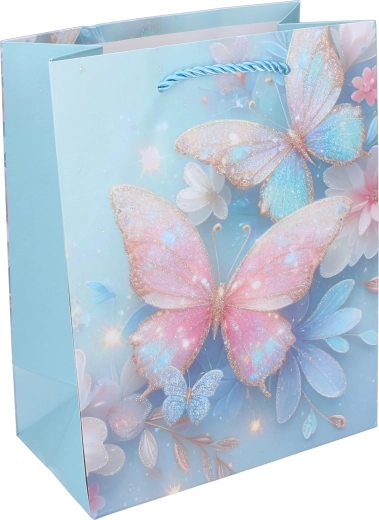 Благодарение на здравата хартиена конструкция, подсиленото дъно и усуканите въженени дръжки торбичката е удобна и надеждна за пренасяне. Лъскавите и блестящи акценти върху пеперудите придават на подаръка изключителна визия, която ще зарадва малките празнуващи и техните родители.