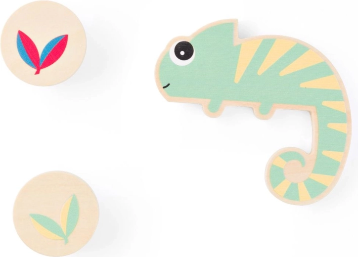 Дървените кръгли жетони с листа насочват децата към сравняване и логическо мислене: търсете листо с два цвята, които хамелеонът няма.