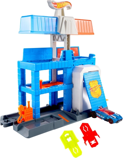 Този страхотен комплект HOT WHEELS CITY Полицейска станция предлага три нива за игра с рампи, изходи и наблюдателна точка за контрол над града. Децата могат да решат дали да тръгнат по страничната рампа или през гаража, създавайки напрегнати истории, пълни с екшън.